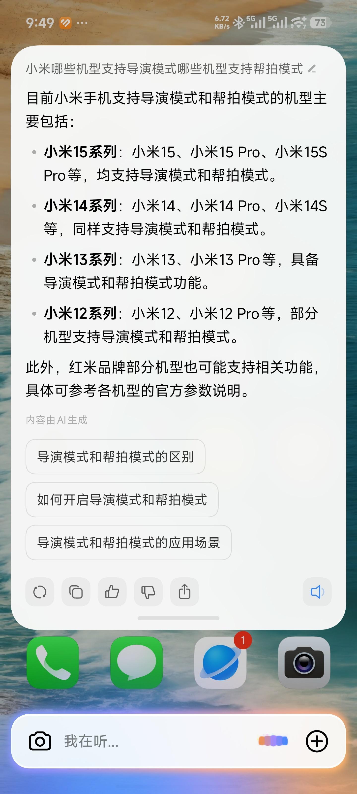 第一次用小米的多机位功能,就一波三折的起因是家里的阳台外墙脱落,我爸说能不能用无人机看看。我说小米手机有多机位功能,一个手机用自拍杆伸出去,一个手机当监视器就行了。于是就用我妈的小米15,和我的小米13ultra。结果发现小米15有帮拍模式,小米13ultra有导演模式,两个还不一样不能搜到对方。我当时就汗流浃背了,又拿出小米17,发现既没有导演模式也没有帮拍模式,我就更懵逼了。又拿出我爸的红米k70ultra兰博基尼,发现同时有帮拍也有导演模式。终于心里有底了。我就感觉很纳闷,就问小爱同学。回答说数字系列两个都支持。然后我让小爱同学打开导演模式,显示暂不支持。我就更懵逼了。摸索了半天终于搞明白了,没有导演模式和帮拍模式的,要进入专业模式,然后切换成录像,然后再下滑点击多机互联。这样才能使用多机位。让小爱同学操作是不行的,它不会。所以尴尬的境地终于解决。但是我依然不知道导演模式为什么说支持但没有了。是并入专业模式了还是什么情况?有没有知道的小伙伴指点一下。