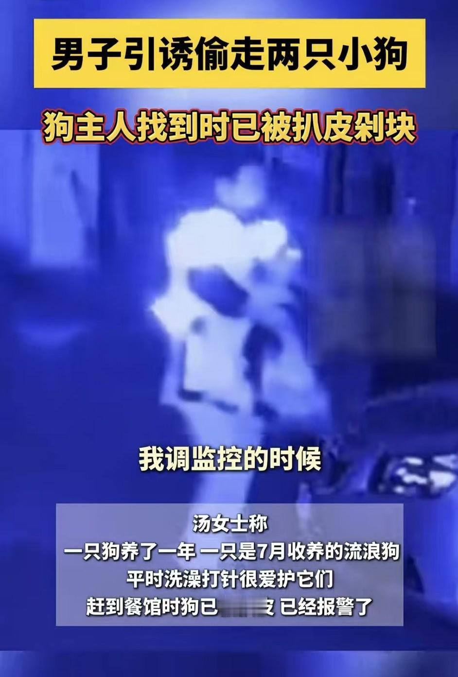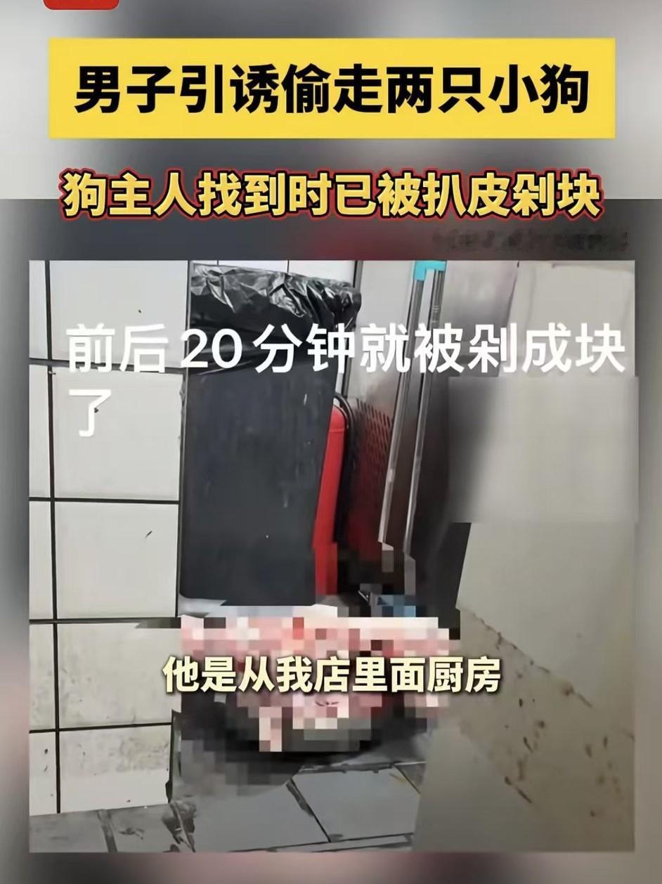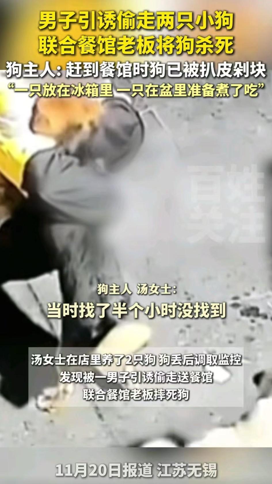 狗走过去是摇着尾巴过去的,还以为会有吃的,结果狗自己被扒皮成为了吃食。 近日无锡偷狗男子和某炒饭店老板合伙偷狗屠狗行为被人曝光。 在说到前后20分钟两只狗就被剁块时,狗主明显声音都哽咽了。 这家店铺并不是狗肉馆啊! 剥皮去骨取肉,难道是用狗肉代替猪肉或牛羊肉炒饭吗?! 还有,管不了别人,咱们只能管好自己。 家养宠物务必不要散养,拴好绳子看住了,别让坏人有可乘之机啊!