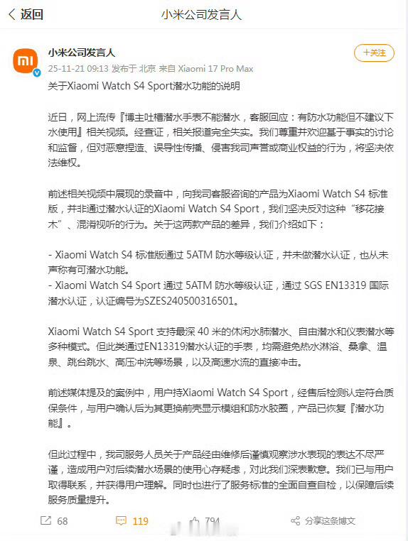 小米官方回应“潜水手表不能潜水”:相关报道完全失实小米公司发言人官博发布《关于Xiaomi Watch S4 Sport潜水功能的说明》,近日,网上流传“博主吐槽潜水手表不能潜水,客服回应:有防水功能但不建议下水使用”相关视频。经查证,相关报道完全失实。我们尊重并欢迎基于事实的讨论和监督,但对恶意捏造、误导性传播、侵害我司声誉或商业权益的行为,将坚决依法维权。前述相关视频中展现的录音中,向我司客服咨询的产品为Xiaomi Watch S4标准版,并非通过潜水认证的Xiaomi Watch S4 Sport,我们坚决反对这种“移花接木”、混淆视听的行为。我还刷到过,一片骂声。小米客服还是重新优化一下比较好。