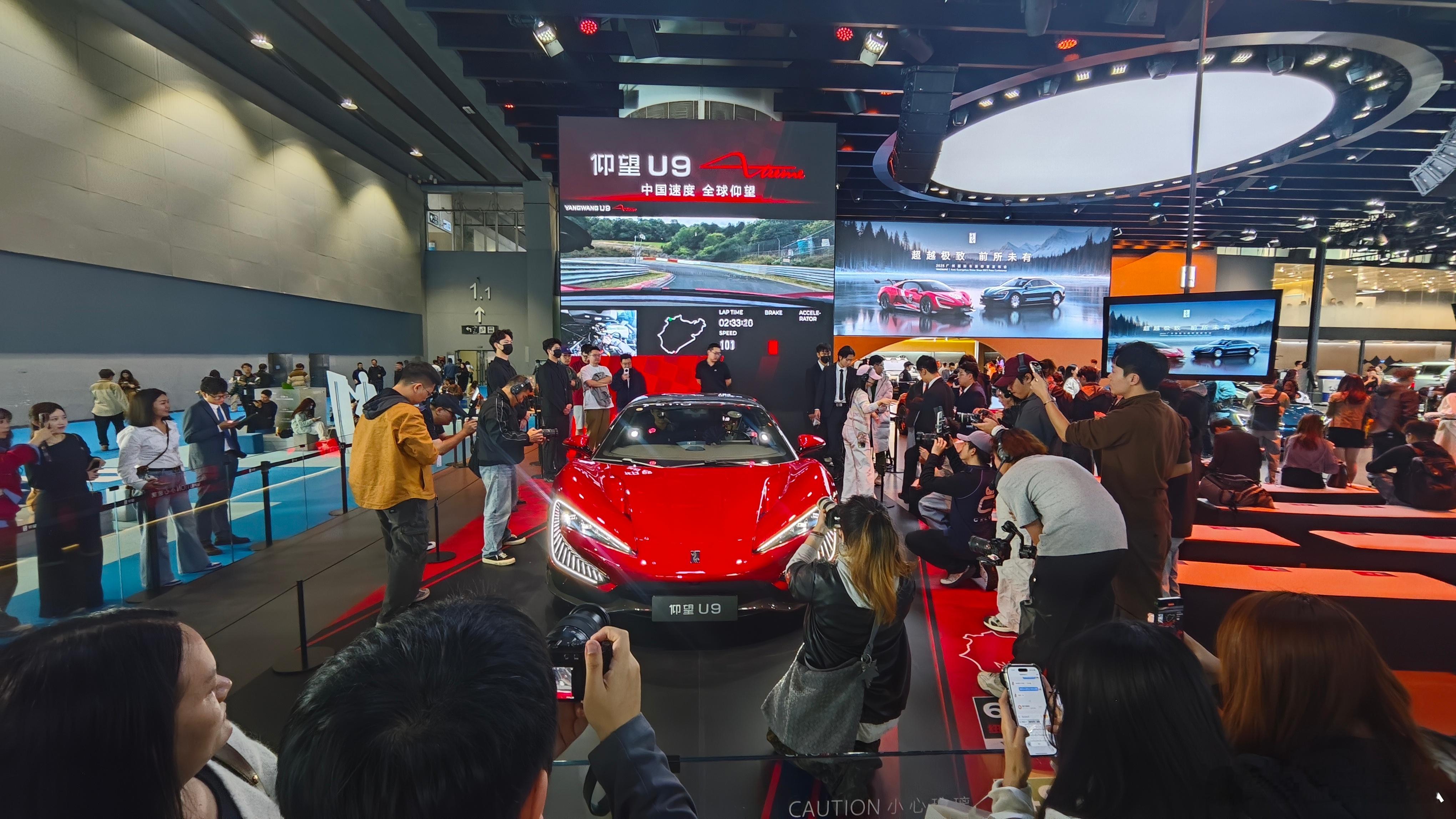 广州车展仰望展台水泄不通,展台内和展台外,都围着人,原来是潘展乐来了。