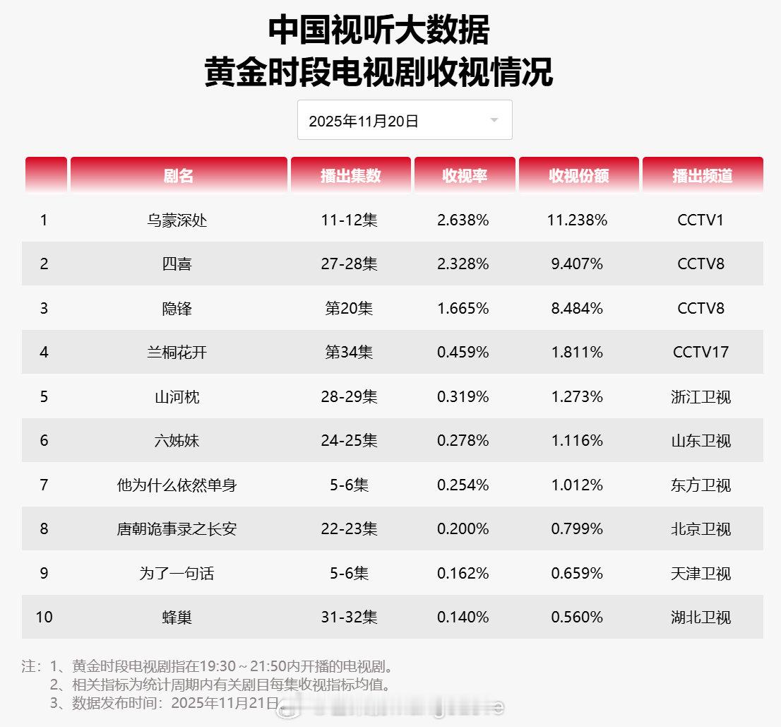 【2025年11月20日中国视听大数据CVB黄金档电视剧收视率日榜TOP10】1 乌蒙深处 CCTV12 四喜 CCTV83 隐锋 CCTV84 兰桐花开 CCTV175 山河枕 浙江卫视6 六姊妹 山东卫视7 他为什么依然单身 东方卫视8 唐朝诡事录之长安 北京卫视9 为了一句话 天津卫视10 蜂巢 湖北卫视