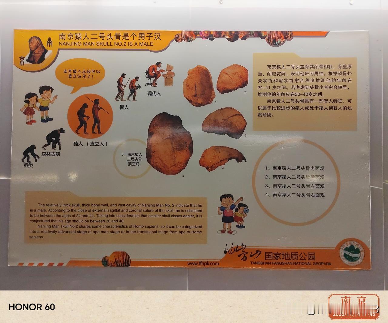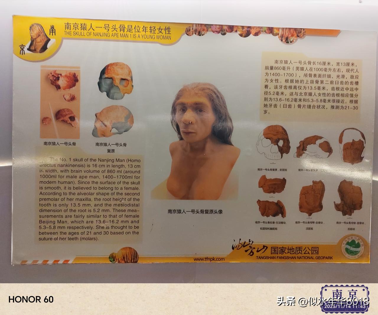 秋日胜景:打卡游玩南京汤山古猿人洞,出土的直立人头骨化石距今30—60万年。 南京汤山古猿人洞景区位于南京市江宁区汤山街道汤泉西路与环镇北路交叉口,距南京市区30多公里,开车前往景区可从沪蓉高速阳山、园博园出口下高速,也可走免费的道路到达景区。景区成人票价22元,景区游客中心设有收费停车场,景区游客中心附近的汤泉西路道路两侧也有不少免费停车位。 从景区的概况中得知,上世纪90年代,位于南京汤山的葫芦洞内发现了两枚距今约30—60万年的直立人头骨化石,是一男一女两枚头骨化石,南京猿人一号头骨化石是位年轻女性,南京猿人二号头骨化石是个男子汉。葫芦洞发现的直立人头骨化石,对于研究古人类分布演化、生存环境具有高度的历史价值和科学价值,被列为全国重点文物保护单位。 自驾导航地址:南京市汤山猿人洞风景区停车场。