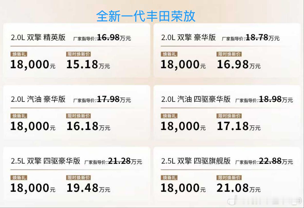 全新丰田荣放15.18-21.08万,版本精简好选购。2.0自吸/2.0油混/2.5油混四驱,各2款,推荐2.0油混。很多配置都是标配了,比如L2辅助驾驶、CarPlay,最低配14.6英寸屏幕。除了最低配其余如全景影像、座椅加热、15.6英寸屏幕、8155P芯片、50W快充。整体来说还是非常给力的,版本也很好选。当然,现在价格来说挺值,但不够惊喜,不着急的可以等等优惠,短期内不会太大