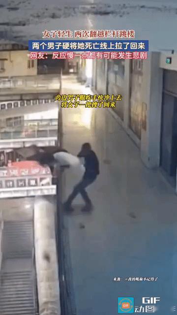 网友震惊了:女子欲轻生,两次翻越护栏欲跳楼,幸亏被两个男子及时拉住,避免了悲剧的发生!也不知道她经历了什么,竟然毫不犹豫,真的是一心求死了! 从视频里看,事情发生在某商场,一男一女刚走到镜头下,不知道两人是不是认识的。男子不知道是不舒服还是累了,走过去爬在护栏上。而女子走到护栏边,毫不犹豫的就抬腿跨过护栏,还好男子反应快,一下冲过去抓住了女子,手机都飞出去了! 即使被抓住了,女子还在试图挣脱男子,一心求死,害怕女子出事男子紧紧的抱住女子,让她不能动弹! 这时又走过来另一个戴帽子的男子,试图去劝说女子,看见他在安抚女子,第一个男子就放手了,去到旁边捡起自己的手机,然后打算走开! 就在这时情况突变,本来情绪稳住的女子,趁红帽子男子放松警惕,又冲到护栏边毫不犹豫的就翻过了过来,就在她要放手的时候,红帽子男子眼疾手快的又把她抓住了。女子整个人悬空在那里,还在试图挣脱。 第一个离开的男子又赶紧返回来帮着一起抓住,但两个人也没办法把不配合的女子拉上来! 不多时商场的保安,还有另外两个女子也过来了。在保安的帮助下一起把女子拉上来了。 第一个男子这次不敢放开女子了,紧紧把她抱在怀里。从这里看,两个人应该是认识的! 看了整个过程,有网友感叹:看到了吧?自杀的人,大家可见多了。唯独是她,动作行云流水,一气呵成。一点都不拖泥带水,她是真的想死。 不知道女子经历了什么,求死的意志这么坚定,也得亏了这两个男子的反应快,但凡慢一点,事情的结局就没那么好了! 从这里可以看出,女子是一个性格倔强,做事果断的人,这样的人一般也很坚强的,到底是多大的事才会让她有了轻生的念头。都说好死不如赖活着,既然两次都被救了,说明命不该绝,既然这样就当死过一回了,接下来好好的活着吧! (视频来源网络,侵删[祈祷])