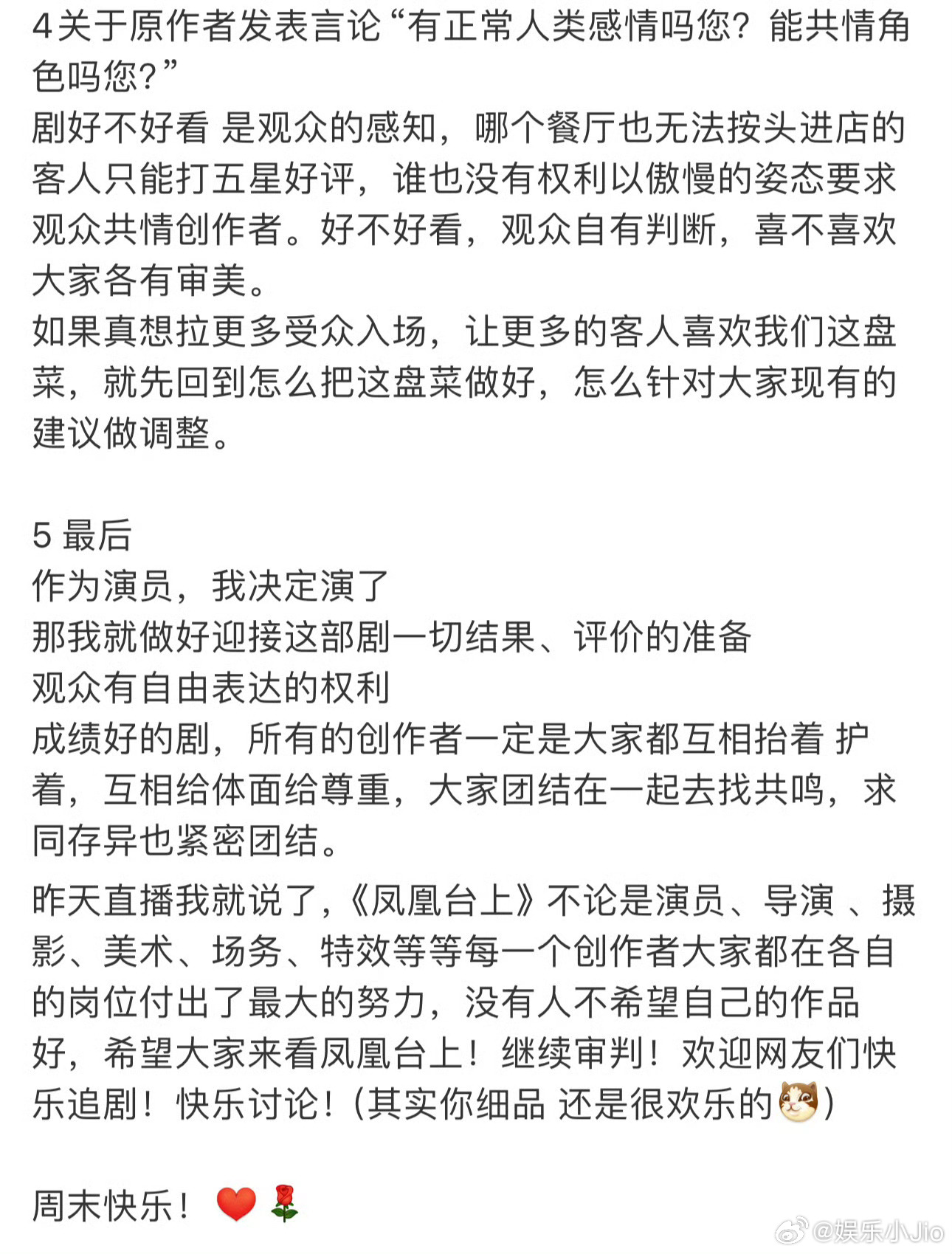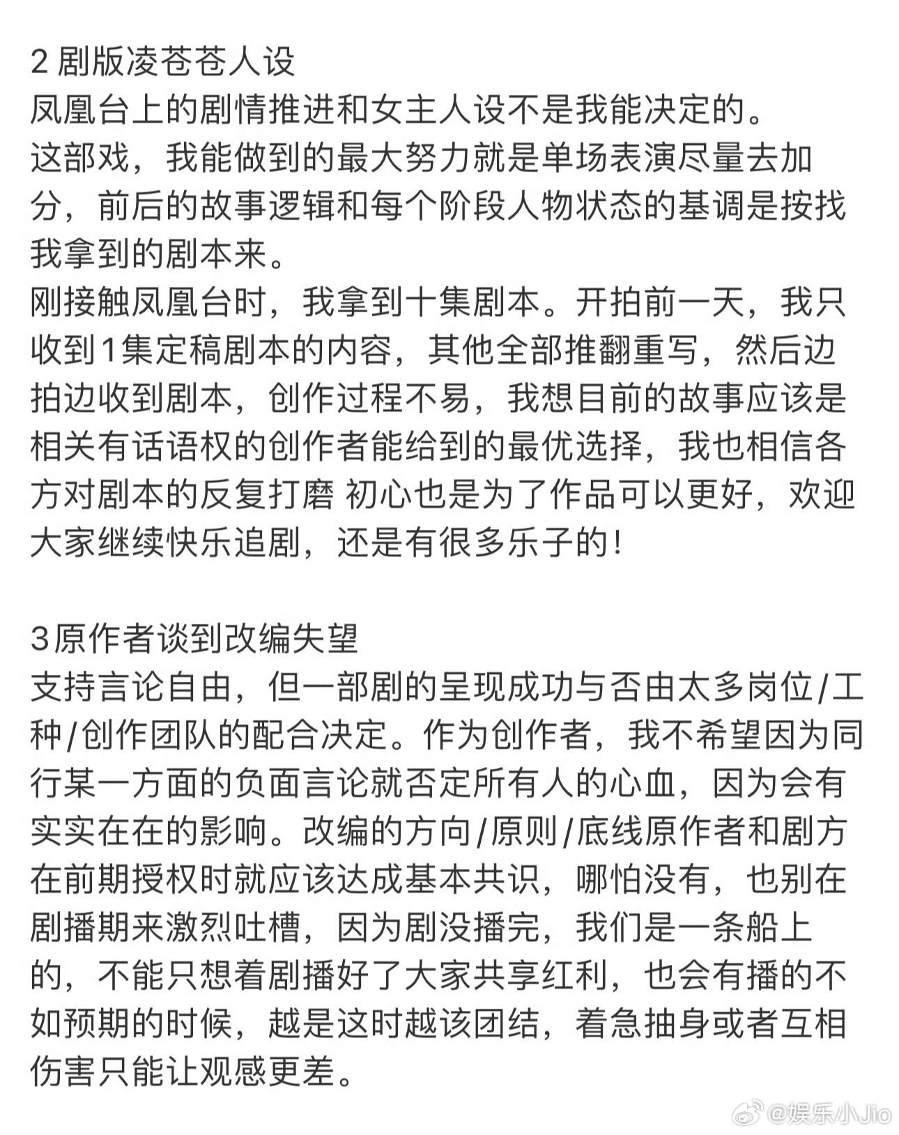 彭小苒发文回应《凤凰台上》的作者,条条框框条理清晰,本来就是啊电视剧是团队的心血