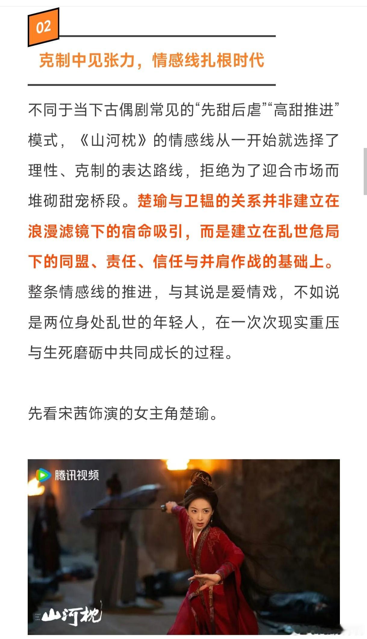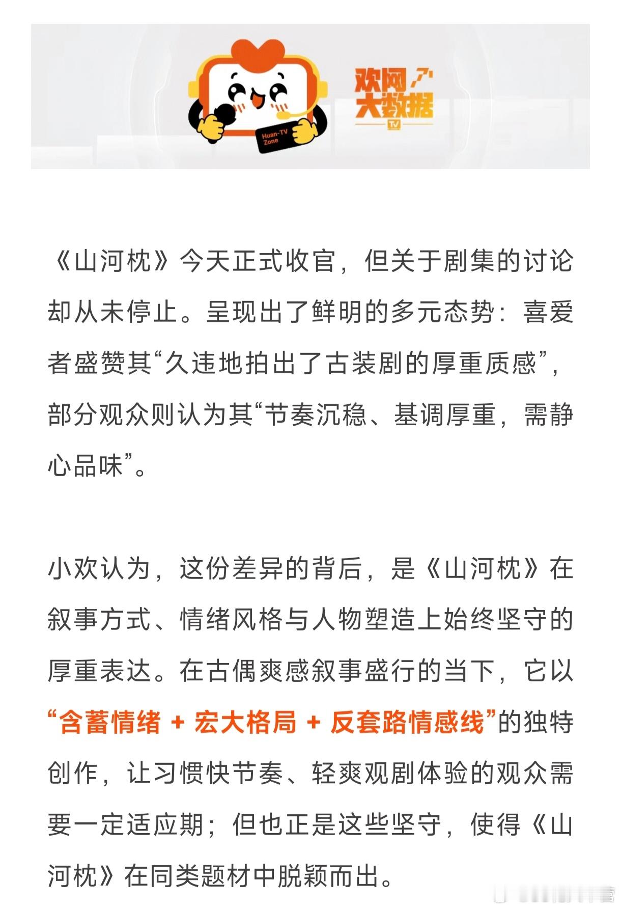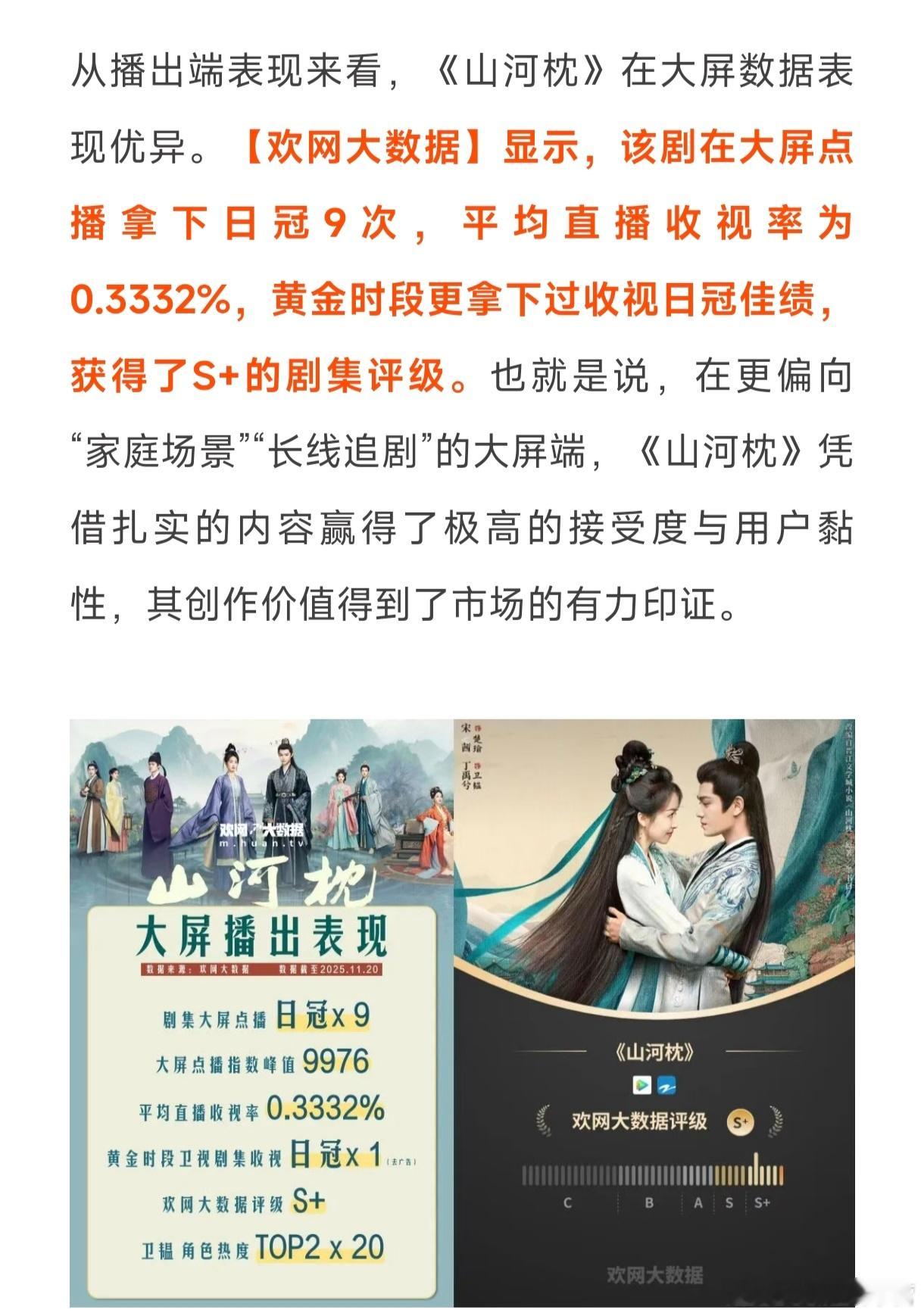 欢网大数据——《山河枕》,其实被低估了!从播出端表现来看,《山河枕》在大屏数据表现优异。【欢网大数据】显示,该剧在大屏点播拿下日冠9次,平均直播收视率为0.3332%,黄金时段更拿下过收视日冠佳绩,获得了S+的剧集评级。也就是说,在更偏向“家庭场景”“长线追剧”的大屏端,《山河枕》凭借扎实的内容赢得了极高的接受度与用户黏性,其创作价值得到了市场的有力印证。从舆情热词来看,楚瑜在社交平台上的话题焦点,与传统古偶“甜爽型女主”有明显差异。欢网大数据研究显示,围绕“楚瑜”的高频热词集中在“坚韧、无畏、赤胆、风华、守护”等关键词上。《山河枕》的成功,不仅在于其亮眼的大屏数据,更在于它证明了古装剧创作可以有多元路径:坚守厚重质感、深耕叙事品质,同样能收获市场认可与核心受众的深度共鸣,为行业提供了一份“以匠心破局”的宝贵样本。