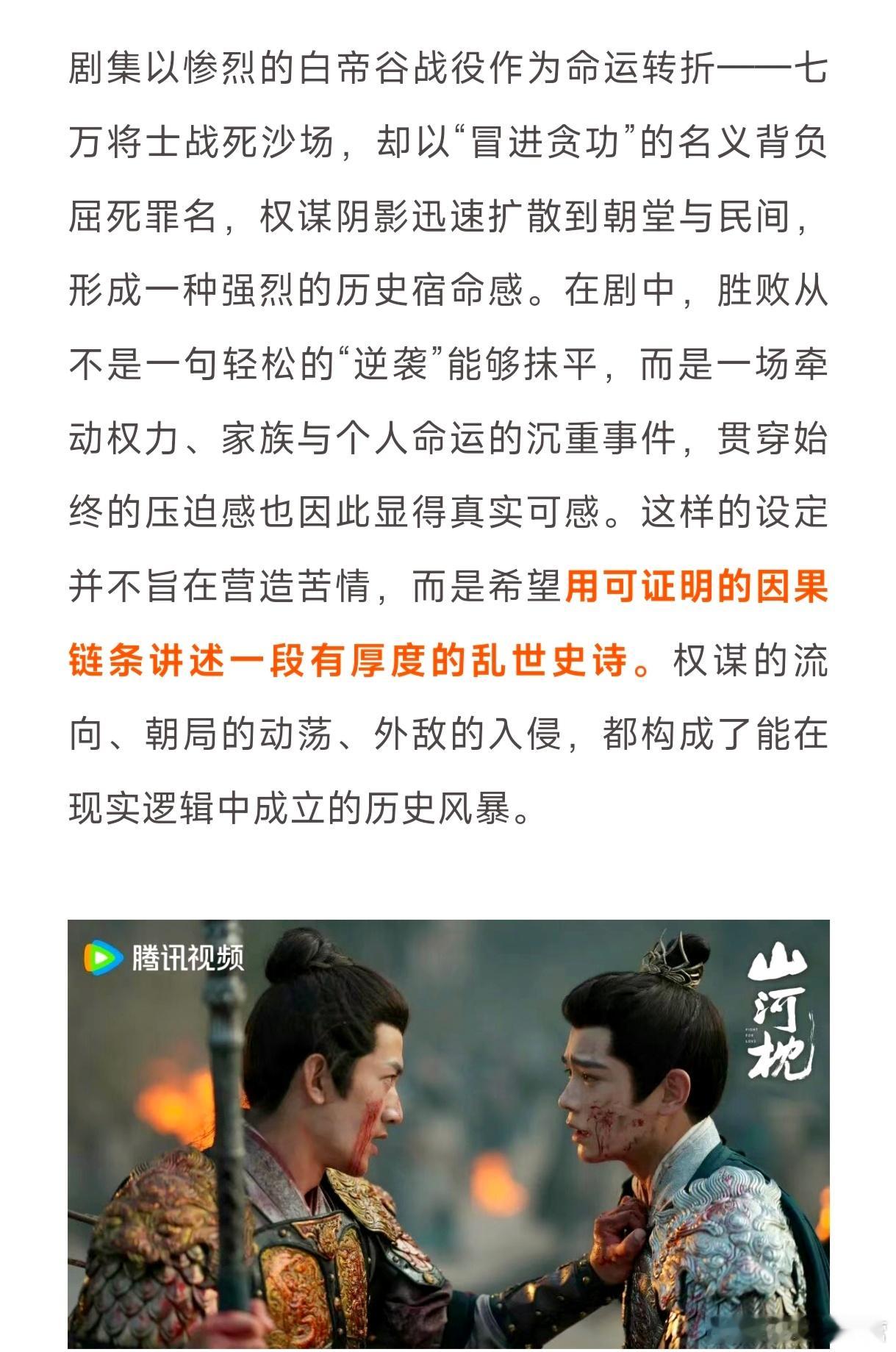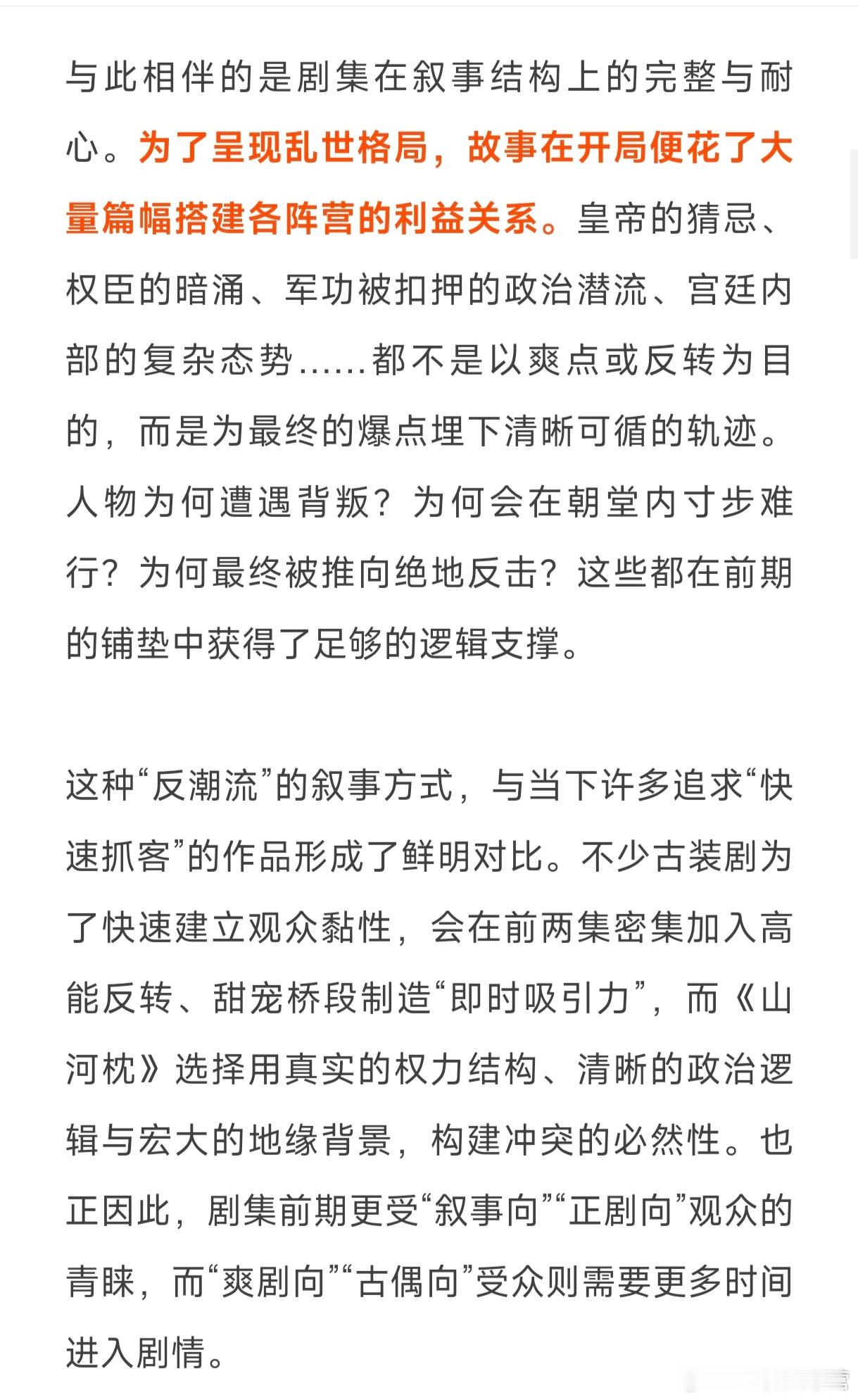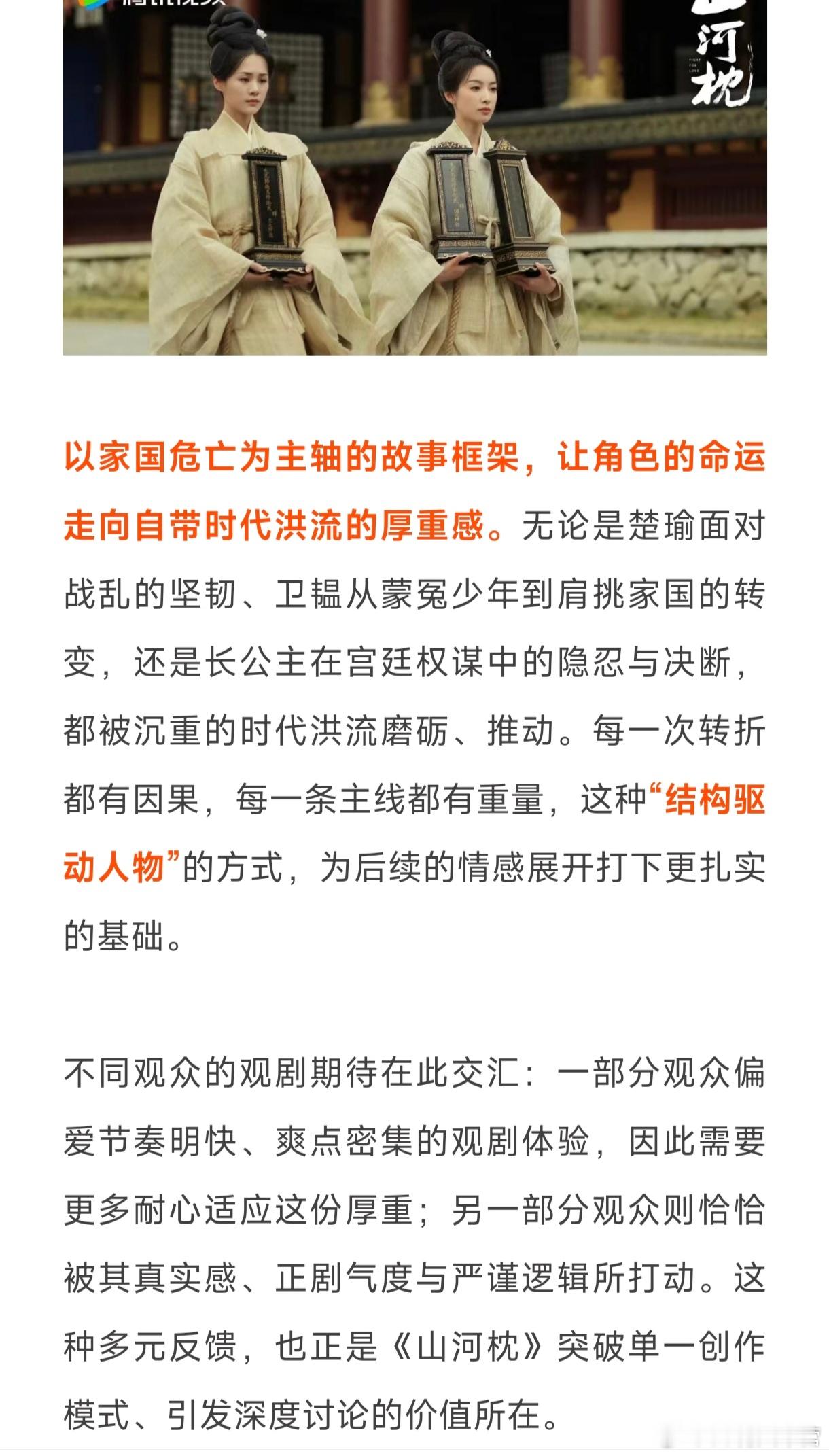 欢网大数据——《山河枕》,其实被低估了!从播出端表现来看,《山河枕》在大屏数据表现优异。【欢网大数据】显示,该剧在大屏点播拿下日冠9次,平均直播收视率为0.3332%,黄金时段更拿下过收视日冠佳绩,获得了S+的剧集评级。也就是说,在更偏向“家庭场景”“长线追剧”的大屏端,《山河枕》凭借扎实的内容赢得了极高的接受度与用户黏性,其创作价值得到了市场的有力印证。从舆情热词来看,楚瑜在社交平台上的话题焦点,与传统古偶“甜爽型女主”有明显差异。欢网大数据研究显示,围绕“楚瑜”的高频热词集中在“坚韧、无畏、赤胆、风华、守护”等关键词上。《山河枕》的成功,不仅在于其亮眼的大屏数据,更在于它证明了古装剧创作可以有多元路径:坚守厚重质感、深耕叙事品质,同样能收获市场认可与核心受众的深度共鸣,为行业提供了一份“以匠心破局”的宝贵样本。