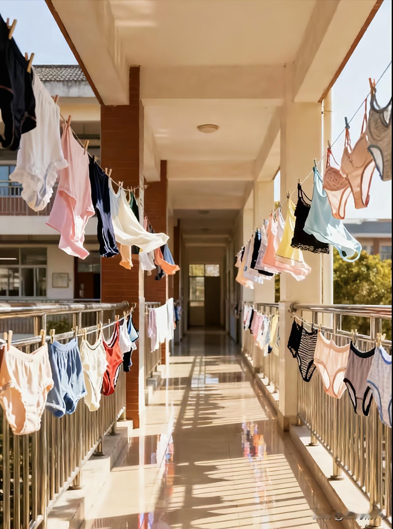 这是大学女生宿舍走廊的一幕[笑哭] 五颜六色的内衣晾晒在走廊两边 在阳光的映照下 在微风的吹拂下 成了一道迷人的风景 这里是女生自豪的地方 在太阳底下晒内衣 不再是什么见不得人的事情 这里也是男生向往的地方 总有男生以各种借口 从这条走廊经过 可目光总是偷瞄两边各色内衣 不知道这些男生 在这些琳琅满目 各种花色款式的内衣中 能不能一眼就辨认出女友的内衣[捂脸] 图源自网络 鸣谢[比心][玫瑰][作揖]
