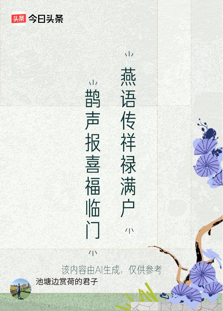 文学创作大会 这副“鹊声报喜福临门,燕语传祥禄满户”对联太妙啦!鹊和燕都是吉祥的象征,“鹊声”“燕语”对仗工整,读起来朗朗上口。“报喜”与“传祥”,“福临门”对“禄满户”,不仅寓意美好,还充满了过年的喜庆氛围。就像那些经典的新春对联,像“一帆风顺吉星照,万事如意福临门”,都在表达人们对美好生活的期盼。对联文化真是博大精深,短短几个字就能承载这么多祝福。大家也赶紧来参加文学创作大会,说不定能写出更惊艳的对联呢!