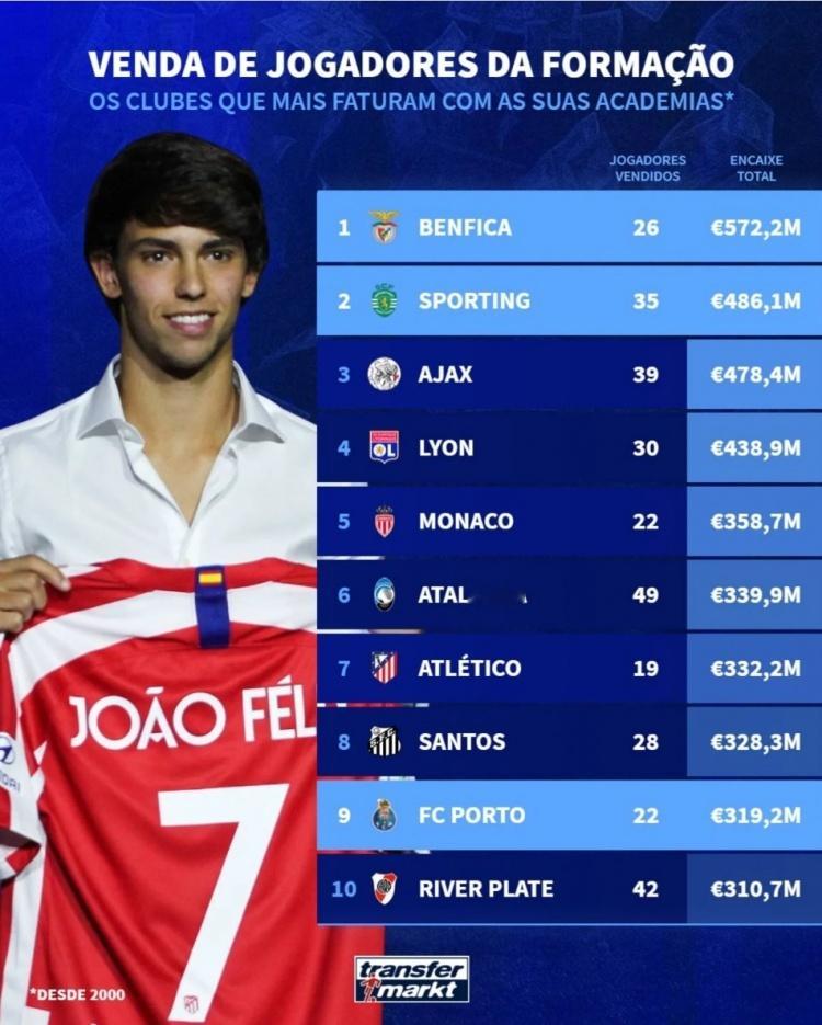本世纪出售青训球员收入榜:本菲卡、葡萄牙体育、阿贾克斯前三,波尔图第九