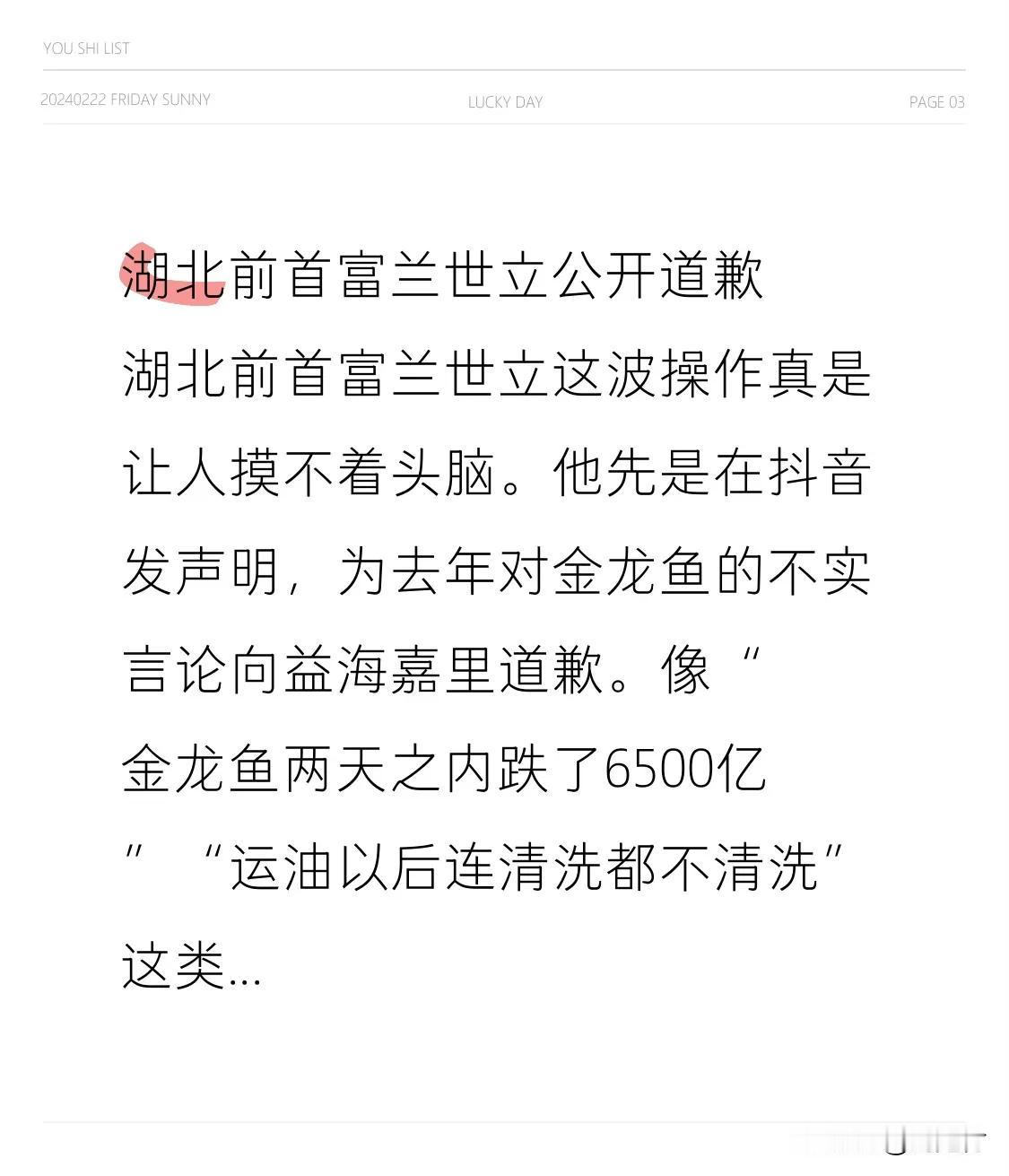 湖北前首富兰世立公开道歉 湖北前首富兰世立公开道歉,这波操作令人费解。他先于抖音发布声明,就去年针对金龙鱼的不实言论向益海嘉里致歉。诸如“金龙鱼两天之内跌了6500亿”“运油以后连清洗都不清洗”等言论,经法院调查均与事实不符,他也因此被判赔偿1万元及律师费。 然而,仅仅10天后,剧情反转,他又公开宣称要向金龙鱼宣战,还表示将就益海嘉里隐匿收款一事提起诉讼。他这种反复无常的态度,实在让人难以捉摸其真实意图。是另有隐情,还是意在博眼球? 这场闹剧也给众人提了个醒,说话做事要有依据,否则就得为自己的言行负责。