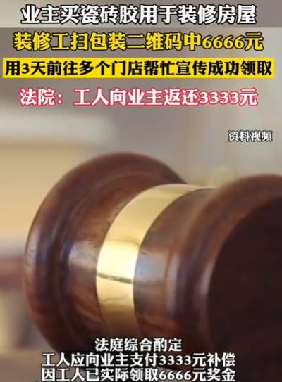 湖北咸宁,男子李某装修房子雇了贴砖师傅王某,施工时王某意外发现瓷砖包装二维码,扫码中了2万红包还抽到6666元奖金,李某得知后觉得奖金该归自己,要求王某返还遭拒,便将对方告上法庭,这奖金到底该归谁呢? 麻烦各位读者点一下右上角的“关注”,留下您的精彩评论与大家一同探讨,感谢您的强烈支持! 李某为新房采购了一批瓷砖,并通过熟人介绍雇佣了有多年手艺的王某负责铺贴。施工过程中,王某发现瓷砖包装上印有醒目的二维码,旁边写着“扫码领红包,抽大奖”的宣传语。 他随手掏出手机扫码,屏幕上竟弹出2万元现金红包到账的信息,紧接着又抽中6666元奖金券。意外的好运让王某一时间难以置信,确认无误后,心情大好地继续干活。 但领奖过程却并不轻松。品牌方要求获奖者必须配合进行线下门店宣传,王某为了完成兑奖手续,前后花了三天时间,跑遍多个门店,拍摄宣传视频、配合拍照、签字,甚至还垫付了交通费用。 完成这些流程后,奖金才悉数到账,他也选择将这份好运和辛苦的劳动成果悄悄收下。 几个月后,李某在一次家庭聚会中无意听亲戚提起王某中大奖的事,经过多方打听,确认奖金来源于自家装修时采购的瓷砖包装。 李某随即找到王某,认为自己作为瓷砖的购买者和所有者,二维码权益本应归自己,中奖所得理应全部返还。 王某则坚持,扫码中奖完全是自己的偶然发现,且为领奖付出不少劳力和时间,理应归自己所有。两人多次协商未果,李某愤而起诉至法院。 这起案件很快引发社会广泛关注。法庭调查发现,品牌方的营销活动规则中,参与扫码抽奖的资格归属于瓷砖产品的购买者。 李某购买瓷砖,享有对二维码等附属权益的法定所有权。从法律角度看,中奖所得应归李某所有。不过,王某作为发现者,不仅主动扫码,还为兑奖付出了实质劳动和时间成本。 法院最终认定,王某的行为属于“无因管理”,即在未受雇主指示的情况下,为他人事务付出合理劳动,依法应获得一定补偿。 法院结合本地人工市场工资标准,计算王某三天为兑奖所付出的时间和努力,判决奖金扣除合理补偿后,剩余部分归李某所有。判决生效后,王某现场履行返还义务,事件以双方认可的方式画上句号。 这起因扫码中奖引发的纠纷,不只是“运气”和“归属”之争,更是数字经济时代消费者权益与劳动价值碰撞的缩影。 在智能手机普及、扫码营销不断渗透日常生活的背景下,商品附加权益的归属问题变得前所未有的复杂。 二维码抽奖、积分兑奖、包装扫码红包,这些原本被视为“谁先发现归谁”的隐性规则,如今在法律和合同的约束下,逐渐回归到所有权和合同约定的本质。 事件也为类似争议提供了现实借鉴。无论是业主还是施工者,都应提前明确涉及商品权益的归属和分配方式。 对品牌和主办方而言,营销活动规则的公开透明同样重要,唯有明确“参与资格”,才能避免后续纷争。 对于普通消费者,这一判例提醒大家,任何商品附带的隐性权益,都不应忽视;而对劳动者来说,额外付出的劳动价值,终究会得到法律认可和保护。 正如案件结束后王某和李某在法院门口的对话所说:“早沟通就没这麻烦。”一次偶然的扫码中奖,最终成为一堂现实的法治公开课,也让更多人开始反思数字时代的“意外之财”到底该如何分配、如何规避纠纷。 你怎么看待商品包装上的抽奖码归属? 信源:业主买的瓷砖胶,装修工人扫码中6666元!奖金归谁?法院判了——极目新闻