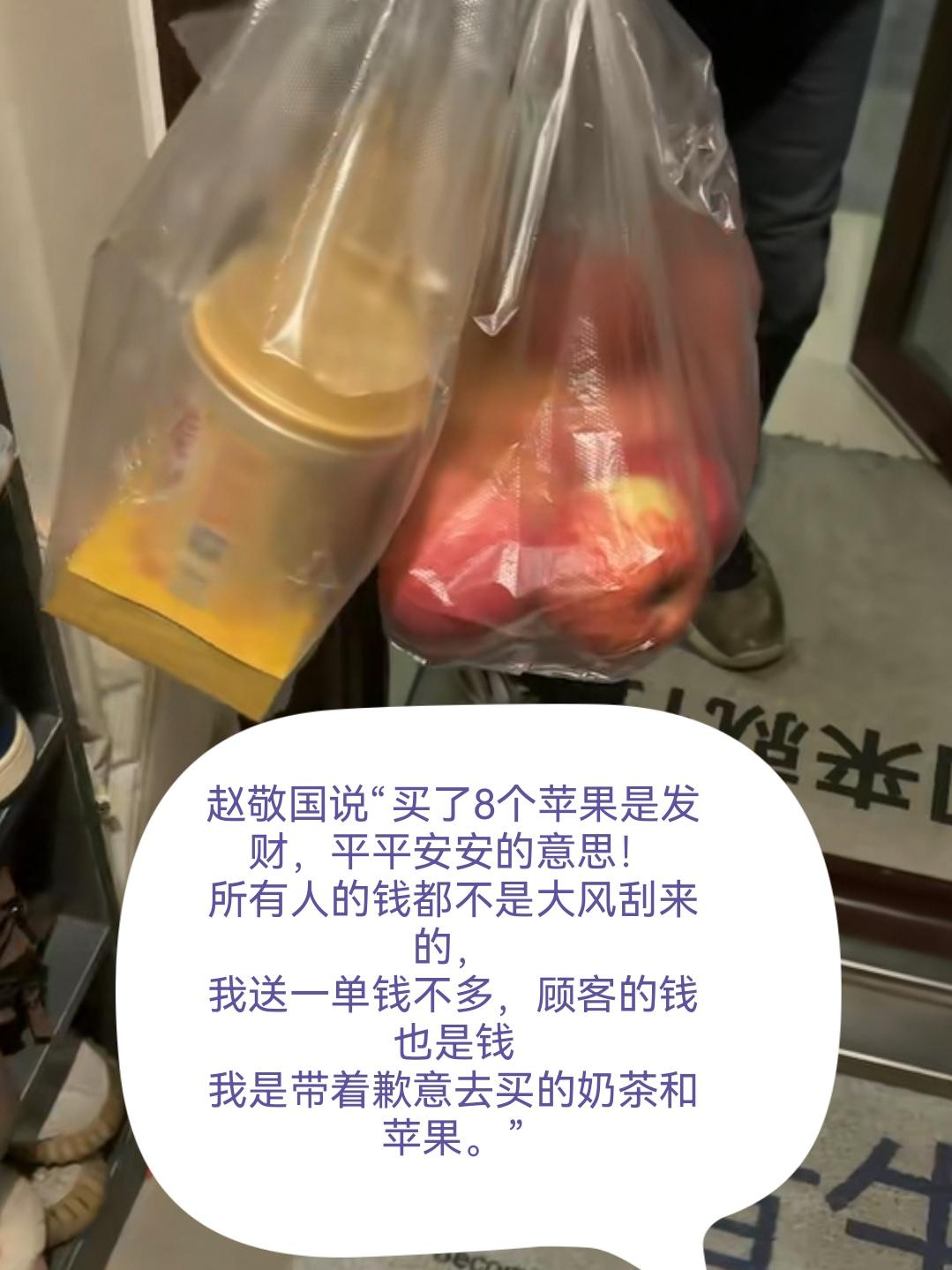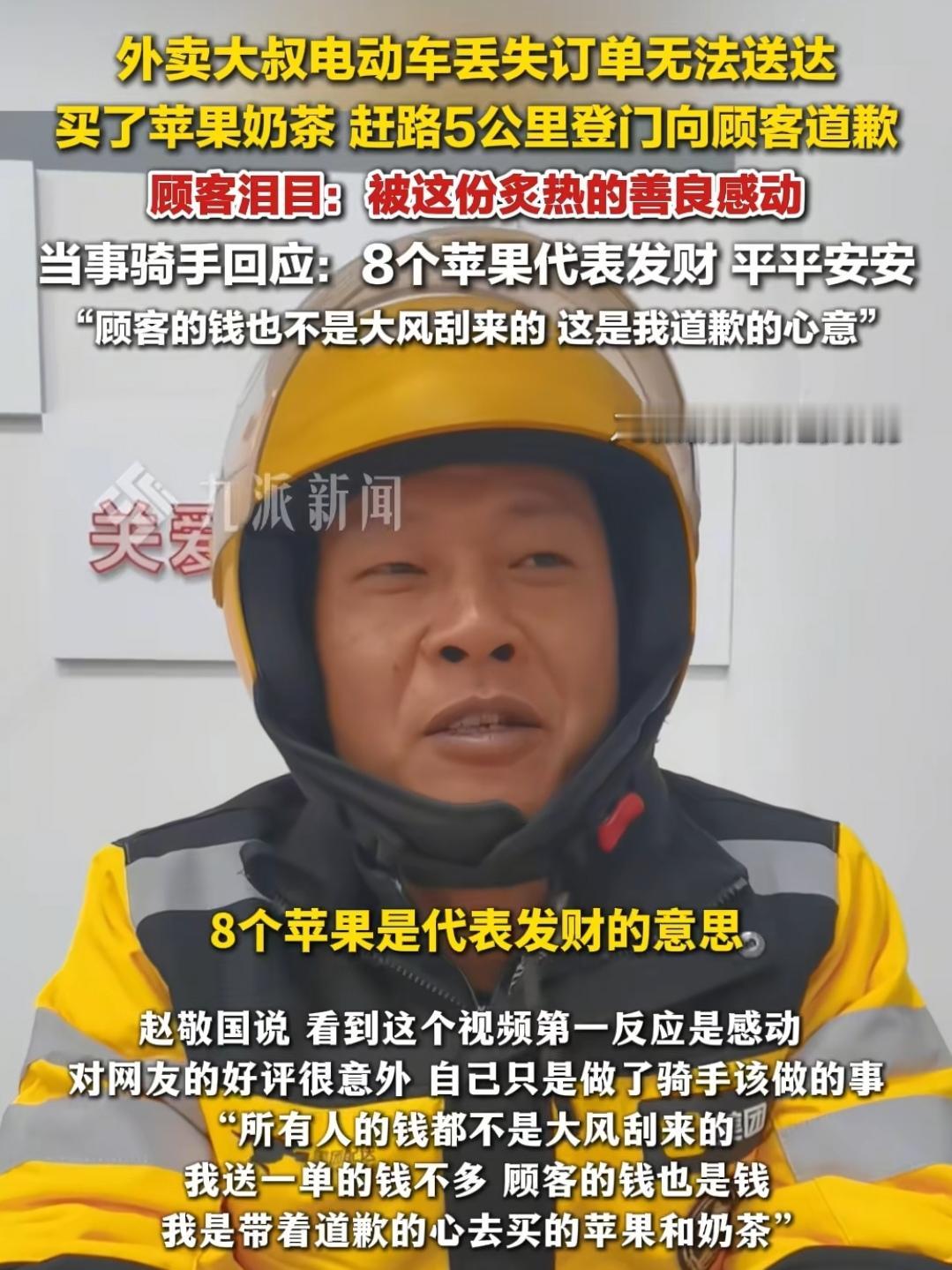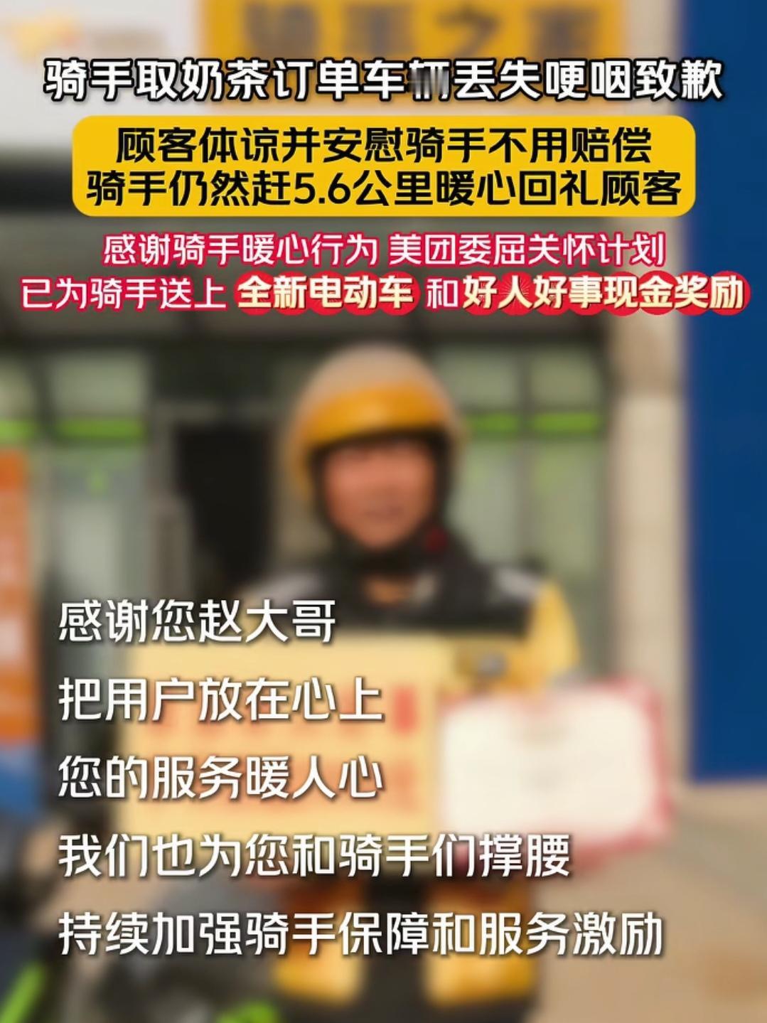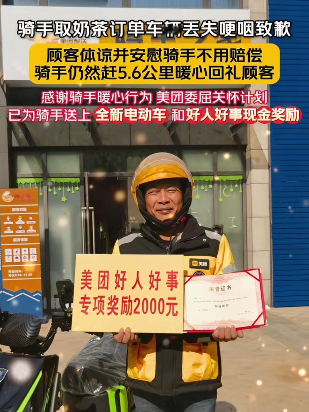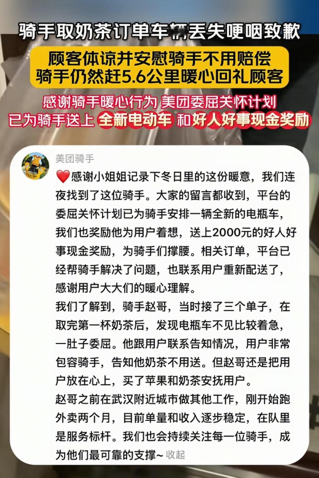 2025年11月20下午,湖北武汉外卖员赵哥取餐后,发现自己的电瓶车不见了,而赵哥停放电瓶车的地方又是监控盲区,无奈之下外卖员赵哥给顾客留言,你的这杯奶茶多少钱,我赔给你,因为我无法给奶茶送到你家里,我的车子丢了,我现在正在找车呢! 点奶茶的客户小姐姐看到外卖员赵哥的留言后,特意给赵哥回了电话,并且安慰他,您先找车子要紧,这个奶茶您就留在手里喝吧! 接到了客户小姐姐暖心的电话,外卖员赵哥委屈得像个孩子一样的哭了,可是这一片没有监控呀! 当天晚上一个小时后,外卖员赵哥找到自己丢失的电单车后,特意又买了奶茶和八个苹果登门向客户致歉! 外卖小哥的单位,看到小姐姐分享的记录视频,连夜给赵哥补了一辆全新的电瓶车,并且送上2000元的好人好事奖励。 这个冬天武汉的夜晚一定很温暖,因为一个客户的暖心举动,温暖了外卖小哥一整个冬天,好人有好报,外卖小哥始终认为是自己的问题,才诚恳地跨越5.6公里特意买了奶茶和苹果上门向客户表达自己的歉意! 小姐姐随手的记录生活视频,又让外面小哥的单位看到了,原来小哥的单位还有这样一个“委屈关怀计划”的平台,连夜给赵哥补了一辆全新的电瓶车,并且还有2000元的好人好事奖励。 这是一个连环的温暖故事,点奶茶的客户,是一个善良的小姐姐,她没有责怪外卖员,而是急人所急的安慰外卖了先找电瓶车要紧,奶茶你留着喝,外卖员赵哥觉得是自己的问题,虽然跑一单赚不了多少钱,但是这就是自己的工作,本着爱岗敬业的原则,赵哥选择了主动承担责任,赵哥的单位也不马虎,连夜补了一辆全新的电瓶车,外卖员的工作特殊性,补了全新的电瓶车,晚上就可以继续工作,全网的网友更暖心,我们点餐不用优惠券了,这个冬天一杯奶茶温暖的不止武汉一座城市,温暖了整个网络平台,相信这两天平台的优惠券大家不要了,但是点餐的数量却在暴涨。