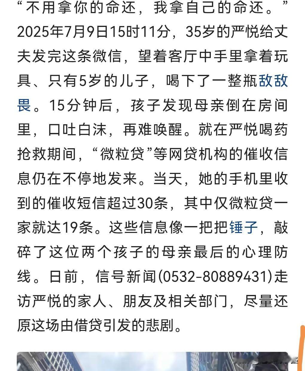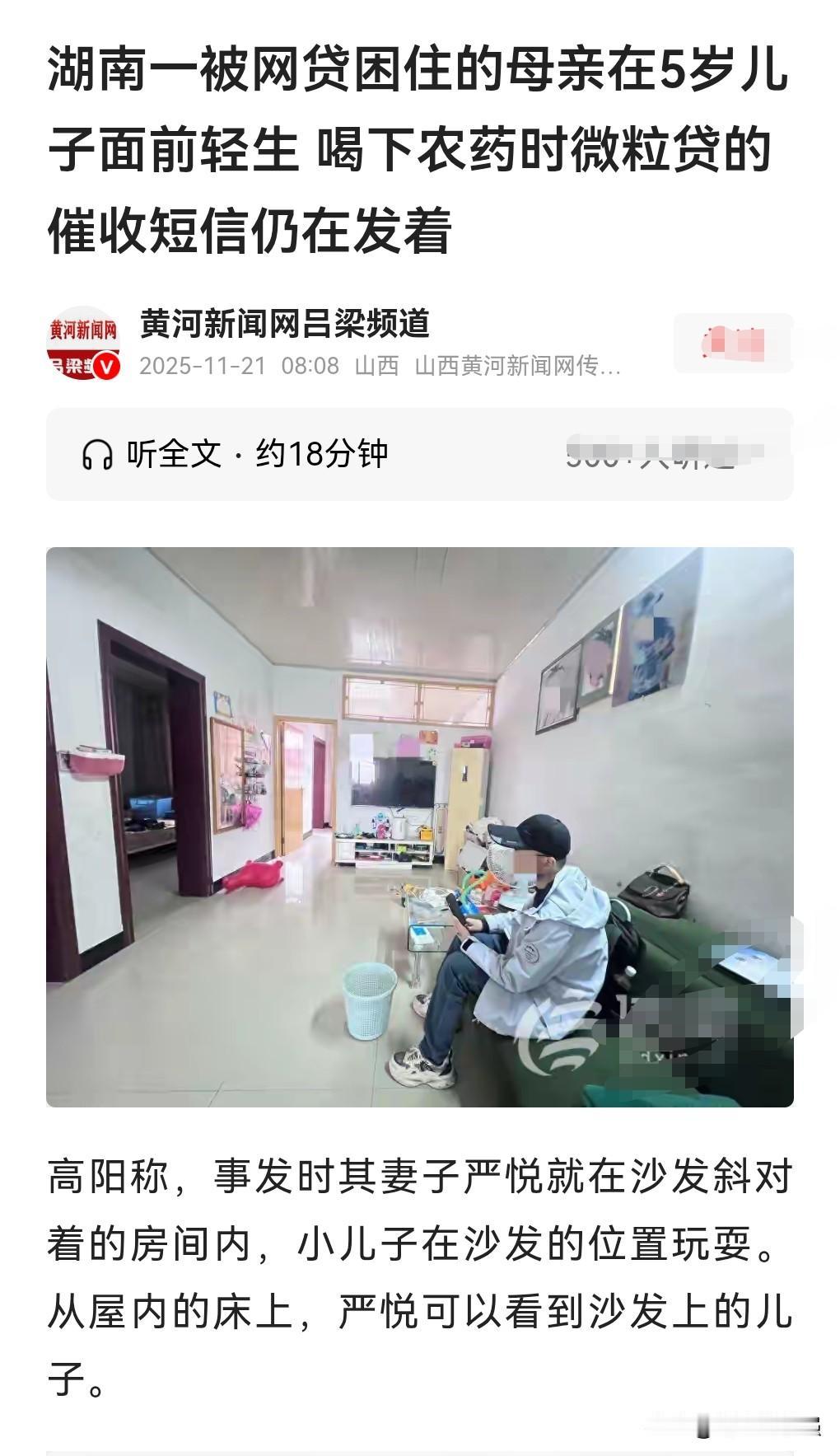 千万别网贷,如果还不上的话就麻烦了,脸皮薄的面对那个压力,真的是很容易走极端。 11月22日在网上看到这么一起事件。 母亲在儿子面前轻生,网贷催收仍在发。 由于还不上网贷,在5岁儿子面前喝了农药。 这真的是太悲剧了。 有多少钱用多少钱,千万别超前消费。母亲在儿子面前轻生 网贷催收仍在发