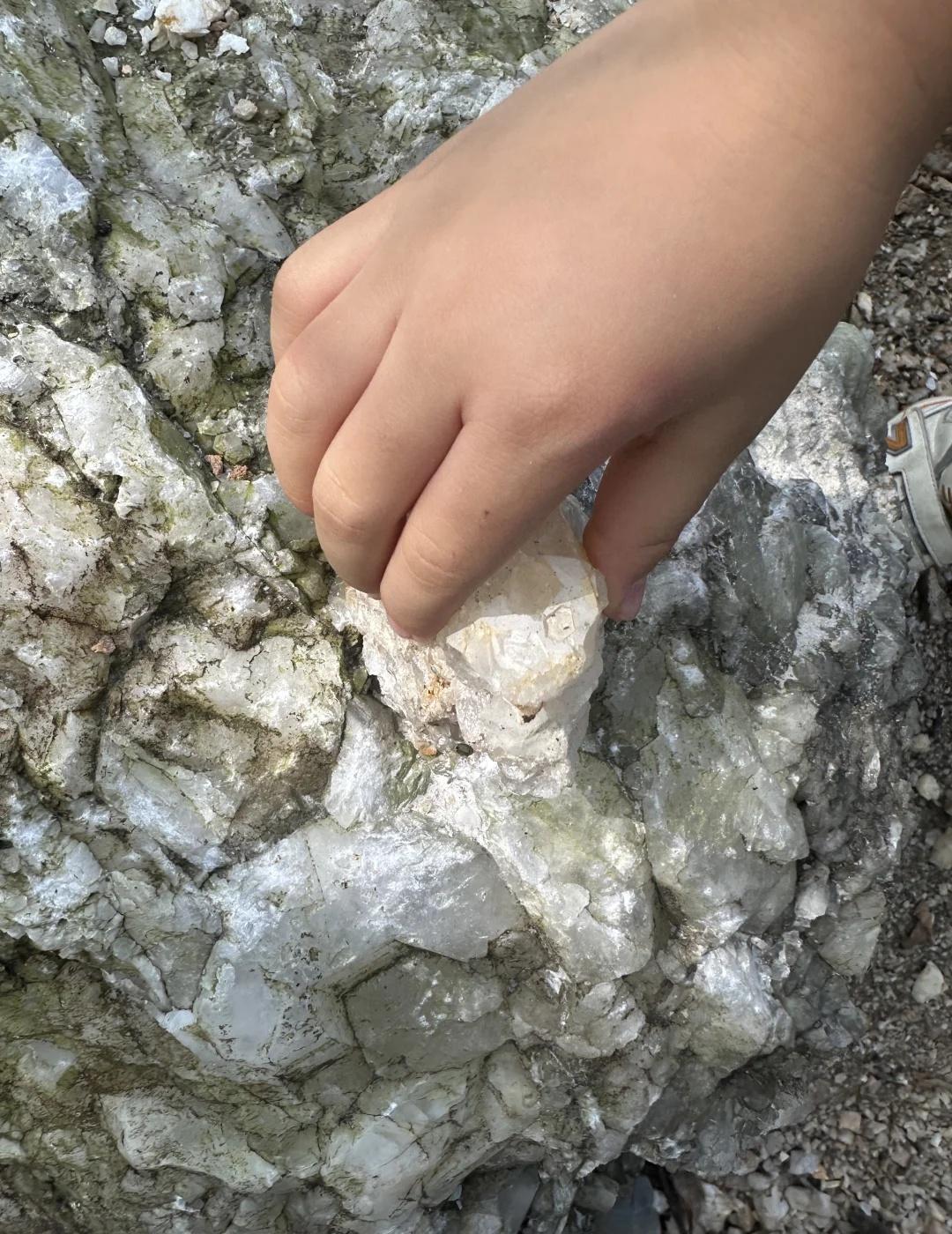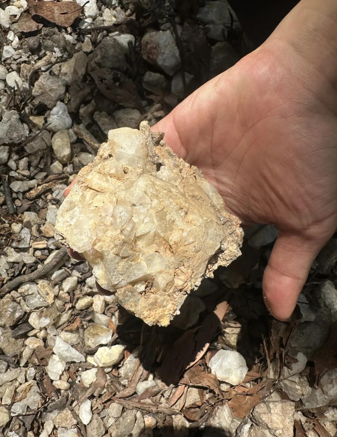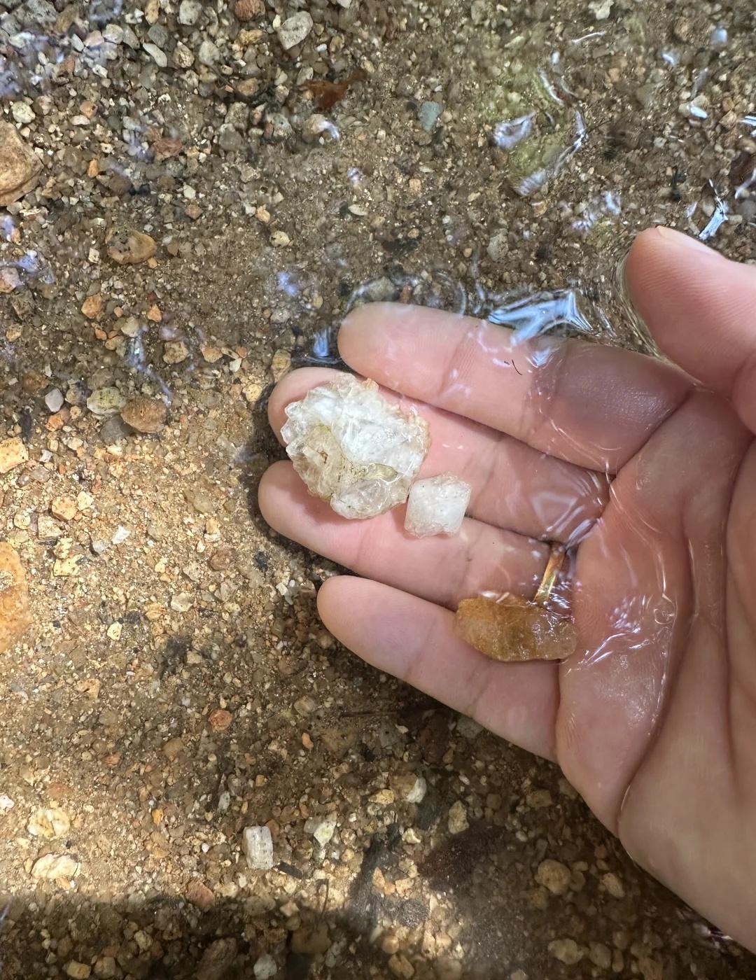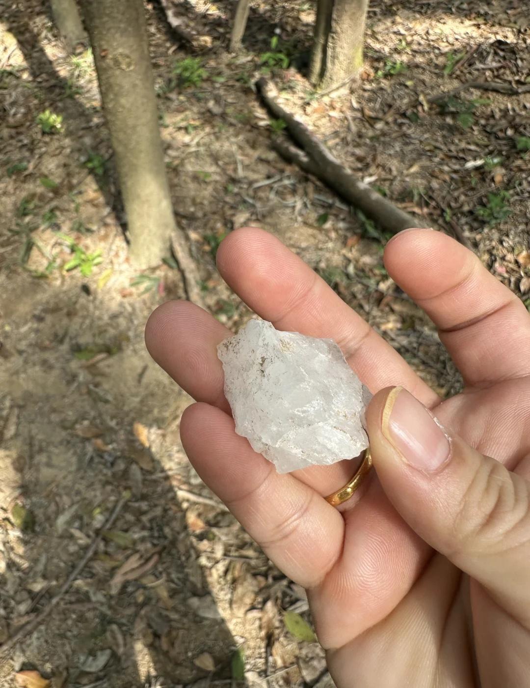 水晶石尖叫地-黄埔暹岗很多超多非常多水晶 从水西地铁站 D 口出来,沿着小道步行1公里左右就到黄埔苏元学校,右拐钻进旁边的林荫小道。也可开车自驾到山脚。🌿 一路绿树成荫超舒服,沿着沥青公路来到登山口,登山口处已经有很多一堆堆的石英石、小水晶,都是些没长大的小水晶😁 接下来是七拐八拐的密林小路,虽然有点野但难度不高。沿途遇见很多橄榄树🫒、荔枝树、木瓜树和香蕉树🍌,科普立意💯。 穿过密林爬升后,迎来第一处水晶堆。当你已经装满一口袋的水晶石后,根本想不到再下坡爬升一段,会来到 “水晶石尖叫宝地”! 毫不夸张说整个山头都铺满大小不一的水晶石,阳光照下亮晶晶,根本就挖不完😂 好多亲子家庭和徒步小团都在这儿敲敲打打,做着“考古”活动罒ω罒 小朋友们挖过瘾之后,下落至山脚有处清凉小溪,刚好小憩,还能把水晶石洗得透透亮亮 休整后到大路扫辆共享单车,就能骑行到苏元地铁站,完美闭环~ 最后还是“sha”个柚子庆祝一下来结尾吧O(∩_∩)O 快摇四小时,8.25公里 两小孩棒棒棒😄 两步路可搜索到路线轨迹,沿途也有飘带指示 最好带小铲子、手套和护目镜,避免碎石划伤 穿长袖长裤 + 防滑鞋,丛林里蚊虫多,记得喷驱蚊水 沿途没有补给,需自带充足饮用水和小零食,挖累了随时补充能量 矿石 疯狂的石头 有趣的石头 神奇的石头 挖水晶