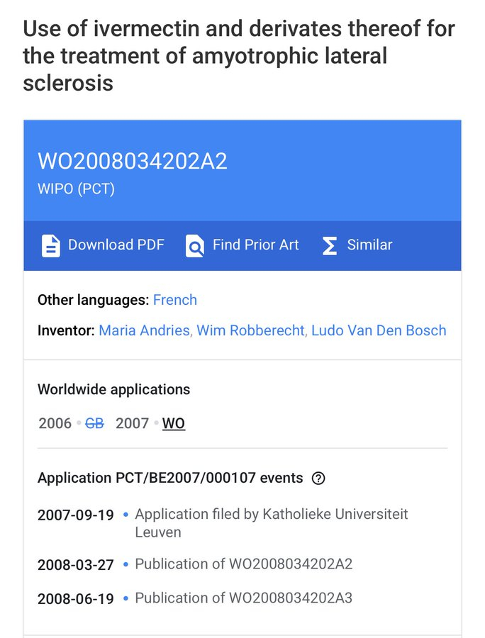 专利:WO2008034202A2伊維菌素及其衍生物在肌萎縮側索硬化症治療的應用Use of ivermectin and derivates thereof for the treatment of amyotrophic lateral sclerosis概要:本發明涉及一種用於治療運動神經元疾病(如肌萎縮側索硬化症)的新型藥物。更具體地說,本發明涉及使用伊維菌素及其類似物來預防、延緩和改善運動神經元疾病(如肌萎縮側索硬化症)及其相關的運動神經元退化。Present invention is directed to a novel medicament for medical treatment of motor neuron disease (NMD) such as amyotrophic lateral sclerosis. More particularly the present invention involves the use of ivermectin and analogues, to prevent, retard and ameliorate a motor neuron disease (MND) such as amyotrophic lateral sclerosis (ALS) and the associated motor neuron degeneration.介绍页面:pdf下载地址: