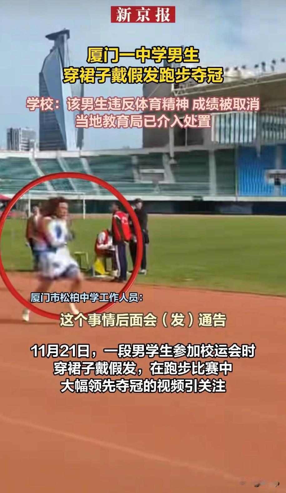 福建的一个中学男生穿裙子 参加学校的运动会,还戴着假发 不过跑的速度挺快,得了第一名 这视频发到网上就有人议论了 说什么的都有,学校现在也取消了他的名次,理由是违反体育精神 运动会上穿奇装异服,明显不合适 估计他平时在学校也是个显眼包 学校方面难道在赛前没有发现情况 很多人觉得这是个小事,没必要大动干戈的,电影里的男演员也有穿过奇装异服,但这毕竟是学校,其他很多学生容易模仿,真有必要做正确的引导