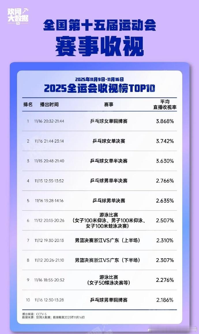 有几个细节值得注意,第一是这个收视数据的直播源是CCTV5,也就是以电视用户为主,女单铜牌赛的播出时间是正经的电视黄金档,这一块肯定有加分的。其次,电视用户的平均年龄其实我们也需要考虑,在年龄稍长一些的观众群体中,朱雨玲和陈梦显然是他们更熟悉的选手。从这个角度来看的话,这个结果说得过去。所以其实各位并不需要在这份收视数据上分个高下,以一份第三方且不完全的统计数据来评价选手孰优孰劣并不客观(即便是完整的、权威的收视数据,也不是评价选手优劣的依据,因为影响收视率的因素有很多。较弱的选手也可以打出精彩的比赛,强势的选手也有可能打得不好)。当然,从另一个角度来说,饭圈也许并不需要看比赛,他们并不注重比赛过程,甚至不注重比赛结果~