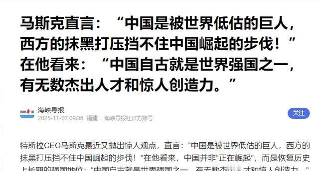 美国被震慑住了!美专家直言:“中国既已亮底牌,美国已无胜算。”对此,马斯克早就说过:“中国是被世界低估的巨人,西方抹黑打压也挡不住中国崛起!中国有大量聪明、才华横溢且勤奋的人,人数惊人。我非常佩服中国的实力。” 2025年5月马斯克又一次公开说,中国人才池大得吓人,大家都特别卷、特别拼,他发自内心佩服。11月他直接在X上再补一刀:中国就是被全世界低估的巨人,不管怎么抹黑打压,该起来的还是起来了。 过去几十年,美国总以为中国就是个世界工厂,只会干点低端活儿,他们掌握着高科技、金融、军事,就能永远卡着中国的脖子。可他们慢慢发现,不对劲了。中国在科技上,从5G到人工智能,从新能源到航天,一个个领域都在突破,美国想封锁都封锁不住了。 经济上,中国已经是世界第一大贸易国,是全球一百多个国家的最大贸易伙伴,这个盘根错节的关系网,美国想剪断也剪不断。军事上,中国的航母、隐形战机、高超音速导弹,一样样都出来了,在台海、在南海,美国想再像以前那样随便横着走,已经不可能了。 这就是中国的底牌:一个在科技、经济、军事上都已经站起来,并且能跟美国掰手腕的全方位实力。 美国为什么没胜算?因为它打的是一场注定要输的牌局。它想用老办法,搞冷战对抗,拉帮结派围堵中国。可世界已经不是几十年前的世界了。美国的盟友,欧洲的、东南亚的,谁也不想跟中国彻底闹翻,因为谁也离不开中国这个巨大的市场和供应链。 美国自己呢?国内问题一大堆,债台高筑,社会撕裂,它还有多少精力和资源去跟中国死磕?它想跟中国脱钩,结果发现脱钩的痛苦自己先受不了。它想在芯片上卡脖子,结果倒逼中国自己搞研发,过几年中国自己的芯片出来了,美国的高科技企业怎么办?这就是美国的困境,它想赢,但手里的牌越来越少,而且每一张打出去都可能伤到自己。 马斯克的话就更实在了。他作为一个在中国有大量工厂、跟中国政府和市场打过无数次交道的美国企业家,他看得最清楚。他说中国是被低估的巨人,西方抹黑打压也挡不住,这绝对不是客套话。 他亲眼看到了中国的效率,看到了中国工人的勤奋,看到了中国工程师的庞大数量和聪明才智。他建一个特斯拉上海工厂,一年就能建成投产,这在美国想都不敢想。他看到了中国从上到下那种想发展、想强大的决心和行动力。这种力量,是任何抹黑和打压都消灭不了的。 说到底,西方的抹黑,其实是一种心虚的表现。他们无法接受一个非西方模式的文明也能成功,也能强大。但事实是,中国有十几亿聪明又勤奋的人,他们渴望过上好日子,这种最朴素、最强大的动力,推动着整个国家滚滚向前。你打压这个,他就在那个领域发展;你封锁这个,他就在另一个地方创新。这种源源不断的内生动力,才是中国最硬的底牌。 所以,美专家和马斯克的话,看似不同,实则说的是一回事。一个是从战略层面判断,一个是从切身感受出发,都得出了同一个结论:中国的崛起已经不可逆转,美国想靠老办法维持霸权,已经行不通了。 这不是因为中国要跟谁争霸,而是因为一个拥有如此规模、如此毅力、如此智慧的民族,它的发展本身就是挡不住的。美国现在要做的,不是想着怎么去赢,而是学着怎么去接受这个现实。