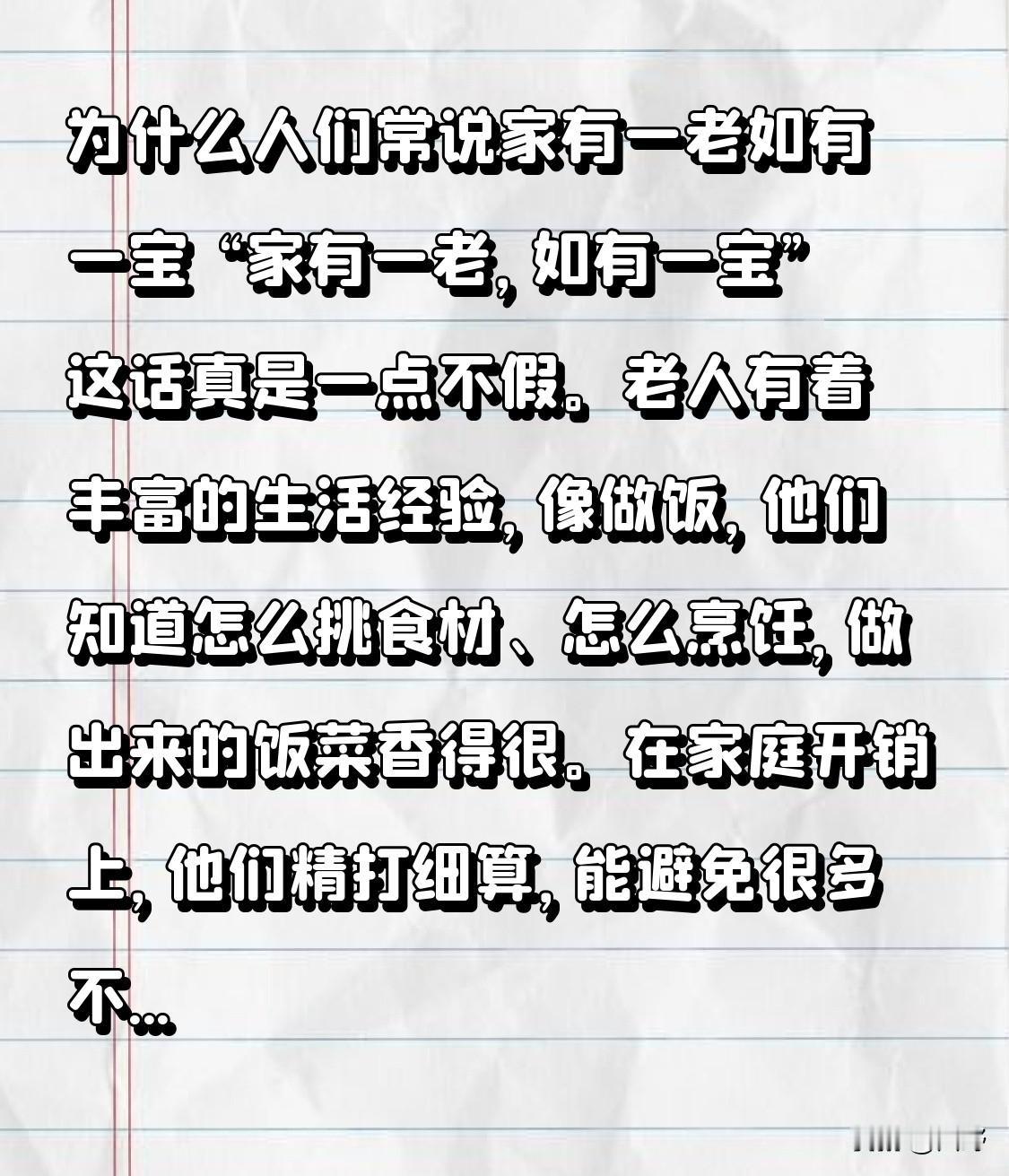 为什么人们常说家有一老如有一宝 “家有一老,如有一宝”这话真是一点不假。老人有着丰富的生活经验,像做饭,他们知道怎么挑食材、怎么烹饪,做出来的饭菜香得很。在家庭开销上,他们精打细算,能避免很多不必要的浪费。 而且老人人生阅历深厚,遇到难题时,他们能凭借经验给出客观建议。我朋友工作遇到困境,他爷爷结合自己的经历帮他分析,让他很快就找到了解决办法。 老人还是家庭情感的维系者。家人受委屈时,他们会耐心安慰。逢年过节,他们精心准备,让家里充满温暖。他们还传承着家风家训,让优良传统代代相传。家里有老人,就是有了无价之宝。
