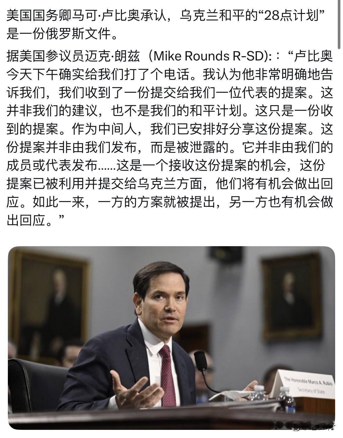 卢比奥这个澄清,非常有意思,咱们得剥开来看看里头的门道。 表面上看,美国是在撇清关系,说“28点方案”姓俄不姓美。但在这个时间节点,通过“泄露”再“澄清”的方式把这一摊子事儿摆上台面,逻辑很清晰——这就是一次精心设计的压力测试。 首先,文件确实可能是俄罗斯起草的,这一点没必要撒谎。但关键在于,美国作为中间人,它的态度是什么?外交无小事,传递即表态。如果美国坚决反对这个方案,这文件根本不会出现在基辅的办公桌上,更不会有现在的舆论发酵。 现在的情况是,舆论反弹超出了华盛顿的预期,大家都在质问是不是要卖队友。所以,把“中间人”这个身份拿出来做挡箭牌,是目前成本最低的公关手段。 别看他们嘴上说“只是给乌克兰看看”,其实这就是在逼乌克兰面对现实。这把手术刀虽然是俄罗斯造的,但递刀子的手,还是美国。所谓的“澄清”,不过是看病人反应太激烈,医生赶紧说“这刀不是我磨的”罢了。