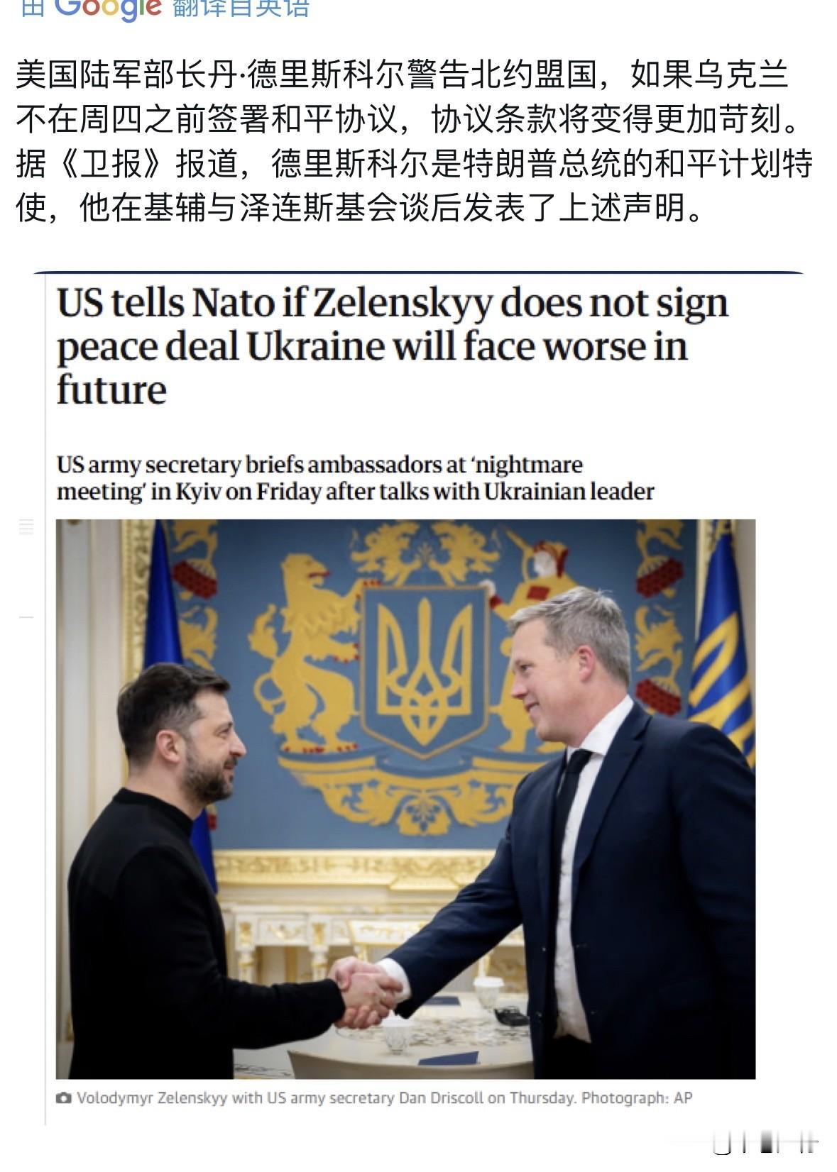 听好了,期限是下周四! 美国陆军部长、川普特使丹·德里斯科尔的警告,等于公开告诉全世界:乌克兰的命运不再由基辅决定,而是由华盛顿的截止日期决定。 “如果下周四前不签,条款会严厉得多。” 这句话的潜台词是:你现在接受的只是割肉,不签的话,下一份文件就是要求你连骨头都要吐出来。 泽连斯基现在面临的,不是战场上的敌人,而是背后计算成本、设置截止日期的盟友。 俄美乌和平谈判 美国乌克兰协议