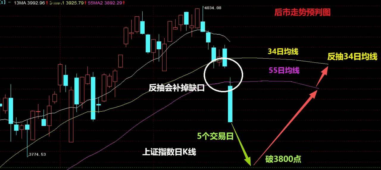 后市走势预判神图:上证指数预期还要调整5个交易日,低点会破3800点。此后大盘会展开反弹,预期反弹时间周期至少11个交易日,空间上会反抽34日均线,补掉上周五的跳空缺口。本微博附图,会不会像上一幅预判神图(附图二)一样被实盘走势所验证?欢迎大家围观并参与验证。关注老张,股市不迷路!点赞评论收藏不要忘了哦!