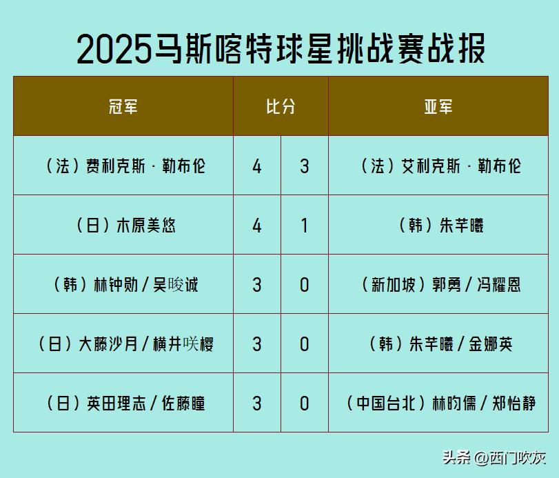 【WTT最后一站挑战赛!日本三冠韩国一冠两亚,勒布伦兄弟包揽男单冠亚军!】 昨晚,WTT2025赛季球星挑战赛最后一站马斯喀特站全线收官。 男单决赛,小勒布伦4-3大勒布伦夺冠,两兄弟在马斯喀特上演终极对决,小勒布伦连赢三局,形势逆转,大勒布伦连扳三局,兄弟两人战至决胜局,小勒布伦11-6胜出。 女单决赛,半决赛赢得内战的木原美悠和朱芊曦遭遇,最终,日本木原美悠4-1击败韩国华裔朱芊曦夺冠,女单日韩对决还是日本更胜一筹,大藤沙月出局不妨碍日本夺冠。 男双韩国夺冠,女双、混双日本夺冠。 都是三项进决赛,日本三冠,韩国一冠两亚,差距主要是在女子项目。