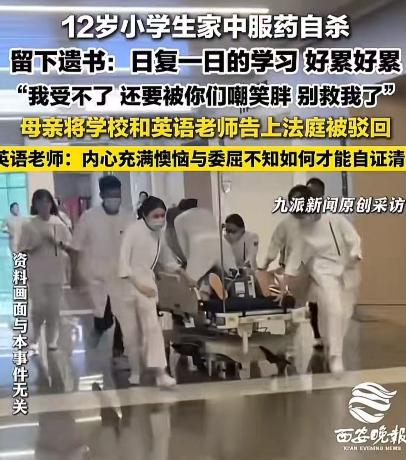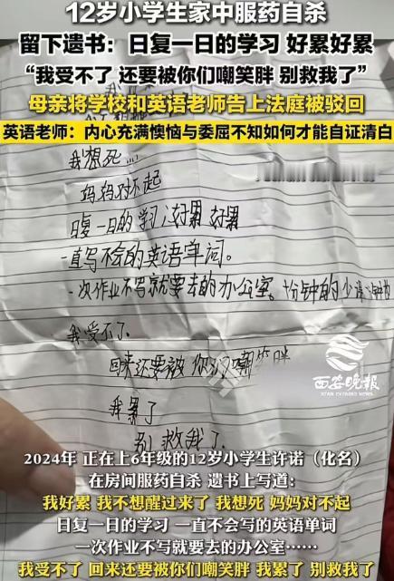12岁小学生家中服药自杀,留下遗书:日复一日的学习,好累好累!我受不了,还要被你们嘲笑胖,别救我了!”母亲将学校和英语老师告上法庭,英语老师: 太冤枉了!不知如何才能自证清白! 六年级的学习压力本就比以往重许多。升学考试即将到来,所有老师都像绷紧了的弓弦。 学校也常常在家长会上强调基础与纪律的重要性:“单词要过关,作业必须按时完成,有问题要立刻纠正。” 这样的安排对很多学生来说只是“正常状态”,可对许诺来说,却像一块块压在肩上的石头。 许诺从不敢对父母说太多自己的困难。父母下班已很辛苦,她怕自己再添乱。有时候作业实在写不出,她只是默默地坐在书桌前,眼泪悄悄掉在练习本上,把纸打湿成一片模糊的灰。 最让她紧张的,是每次英语测验后的“订正”。新来的英语老师赵言老师年轻、做事认真、说话干脆。她接手班级才十几天,班里学生普遍对她还没形成清晰的印象。 “许诺,错这么多过来一下。”赵老师叫她去办公室时,只是想问问孩子哪里不会,顺便帮她把几个单词记熟。但赵老师不知道,每叫一次办公室,对许诺来说,就是一次“失败的声明”。 许诺站在办公室外,总觉得里面的目光都在看她。赵老师并未凶她,只是认真地说:“这些单词要记牢,明天我再抽查。”但这句话像一根绳子,悄悄把她心里的焦虑拉紧。 更让她难受的,是回到家后父母偶尔说的那些“随口话” “你看你这点破英语怎么还学不会呀?” “再胖一点脑子都不灵光了吧?” “别人家的孩子怎么都没问题?” 事情发生那天,是一个阴冷的周三。学校下午有一次英语小测验,许诺因为前一晚背单词到很晚,几乎没睡够。考试时她脑子一片空白,连平时会写的也写错了好几个。 卷子发下来后,赵老师叫了她的名字:“许诺,放学来办公室一下。” 班里几个调皮男孩轻笑起来,其中一个小声嘀咕:“又是她,胖胖的脑子转不动吧。” 这种嘲弄并非第一次,可每一次,许诺都假装没听见——只是这次,她心里的防线被悄悄撕开了一个口子。 放学后,她照旧去了办公室。赵老师语气并不严厉,只是说:“这些单词你还是没掌握呀?我们再把错误订正一下,好不好?” 她点点头,眼眶却酸酸的。 回到家,家里没人,父母加班晚归。她把书包扔在桌上,坐在床沿,看着摊开的英语作业本,感觉胸口像堵着一团压不散的雾。 那一刻,她只是觉得——好累。 那封遗书写得歪歪扭扭,每一个字都像是孩子在黑暗里摸索出来的求救。 “我好累。我不想醒过来了。 我想死。 每天的学习,我真的撑不住了。 那些单词我背不下来,不是我不想学。 作业没写就是办公室,我好害怕。 回家还要被你们笑我胖…… 我真的好累了。 别救我了。” 母亲下班回到家,看见女儿倒在房间,旁边放着药瓶——她第一时间拨了急救电话。 在医院昏暗的走廊里,母亲握着那张纸,哭得几乎说不出话来。 “为什么要这样对我的女儿?她才十二岁啊……” 当她看到遗书里提到“办公室”“作业”“嘲笑”,她悲痛得难以接受,情绪崩溃地认为老师和学校让孩子承受了巨大的压力。 于是,她把学校和赵言老师告上法庭。 在公众舆论最激烈的时候,媒体标题甚至写着:“12岁女孩因老师批评而轻生?” 这些刺目的话像刀子一样插在赵老师心里。 面对法庭,赵言老师哽咽着说:“我才接班十几天,我……真的不知道她压力这么大。我叫她去办公室,只是想帮她……” 她带来了自己的工作记录:孩子被叫去办公室只有三四次,而且每次都在课间或放学时,办公室还有其他老师在。赵老师解释:“我没有罚写,也没有罚站。我只是想辅导她。” 法庭审理了多方证据:作业安排、课堂纪律、其他学生证词、视频记录等。 法院最终认定——老师的行为属于正常教学交流,与孩子的行为之间无法形成直接因果关系,因此驳回了全部诉求。 事情在网络上掀起了巨大的争议。 有人说:“我们当年学习压力比现在大多了,怎么都没出问题?” 有人反驳:“你没出问题,不代表别人不会。每个孩子承受能力不一样。” 也有人说:“家庭教育的言语嘲讽,比老师的批评更伤孩子心。”