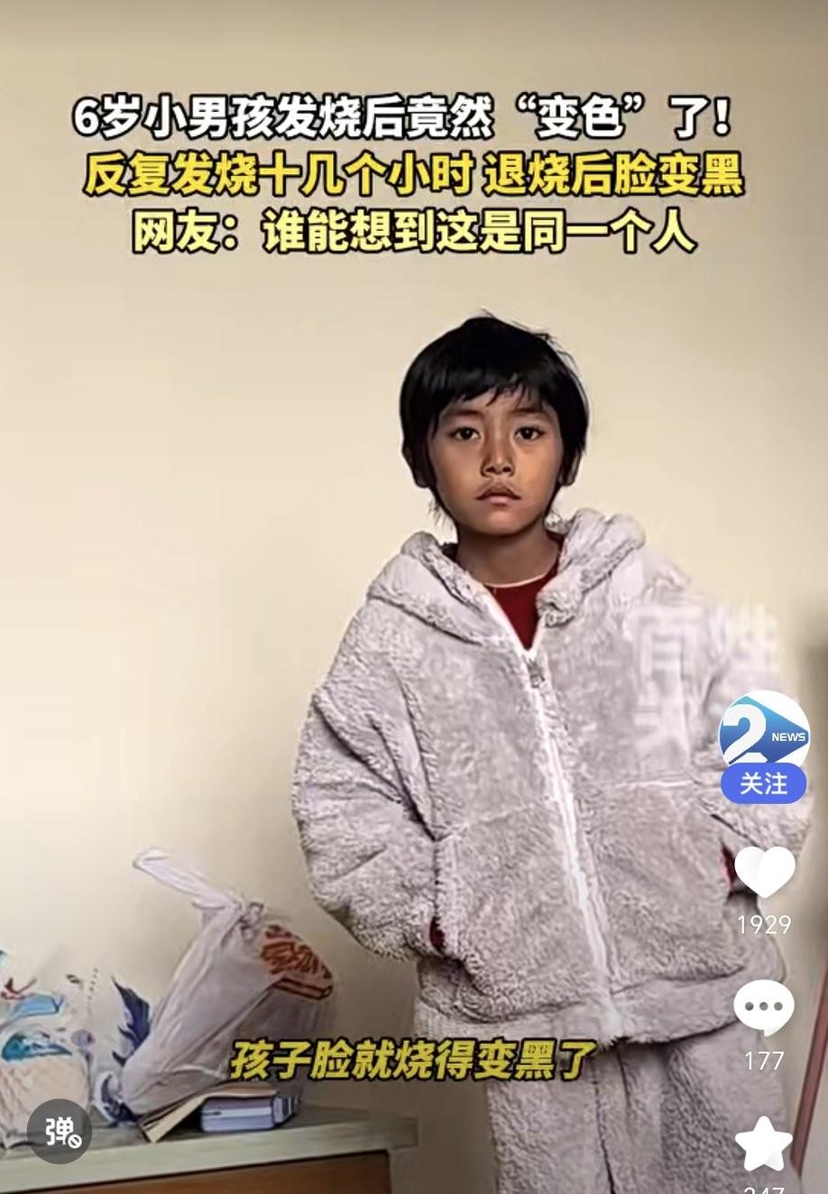 湖南衡阳6岁小男孩,高烧40度烧了十几个小时,退烧后脸竟变黑,把妈妈陆女士吓坏了。网上也是众说纷纭,有人说“烤焦了”,有人说代谢加速。 A网友:疫情时我高烧了三天,整个人变成黑红色,因为我内分泌紊乱满脸长痘,但是退烧后我皮肤超级光滑。大概半个月就又变回来了。 B网友:高中一同学小学时发高烧烧黑了,到高三的时候皮肤都没恢复过来,关键他一家人除了他皮肤都是很白皙的,他和他哥站一起简直是海尔兄弟。 C网友:肾脏受损严重的表现,皮肤的黑素小体在炎症情况下会分泌增加,用烟酰胺涂涂就好了。 D网友:果然一白遮百丑,白的时候软萌可爱,明明一样的五官,黑了就觉得土。 其实孩子退烧后脸变黑,大多是正常反应。可能是炎症消退后的色素沉着、药物反应、血液循环调整,肝脏功能异常或者退烧时能量消耗大有关。要是孩子只是脸黑,精神和食欲都正常,多补充温水、做好皮肤保湿、保证休息就行。但如果伴有精神萎靡、呼吸急促、呕吐腹泻等症状,就得赶紧去医院。家长们别慌,这种情况通常是暂时的,科学护理,孩子很快能恢复。