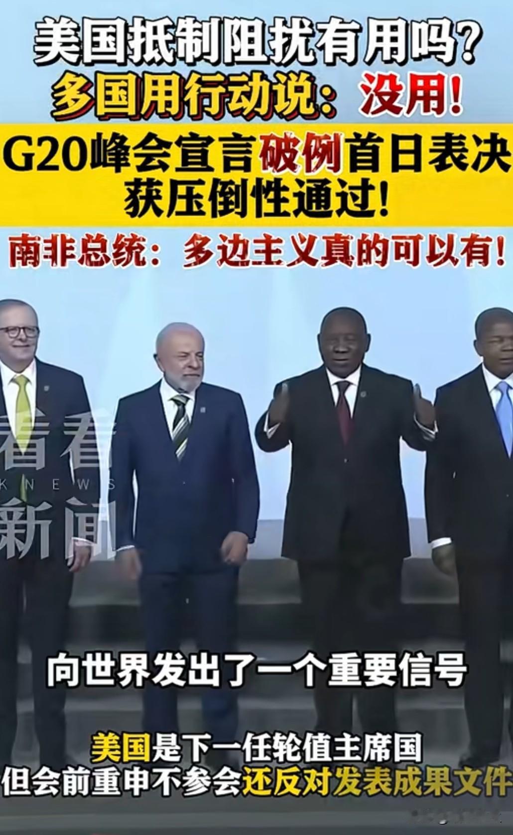G20宣言获多数成员国通过,美国反对无效。这一结果表明,多边主义仍是国际社会的主流共识。尽管单边主义和保护主义有所抬头,但面对全球性挑战,各国仍需加强合作。 宣言强调应对"当今人类面临的威胁"需要采取"多边主义"策略。这一表述直指当前国际秩序的核心问题。在气候变化、公共卫生、经济复苏等议题上,各国利益交融,唯有合作才能共赢。美国的孤立立场不仅无助于问题解决,还会损害其自身国际影响力。