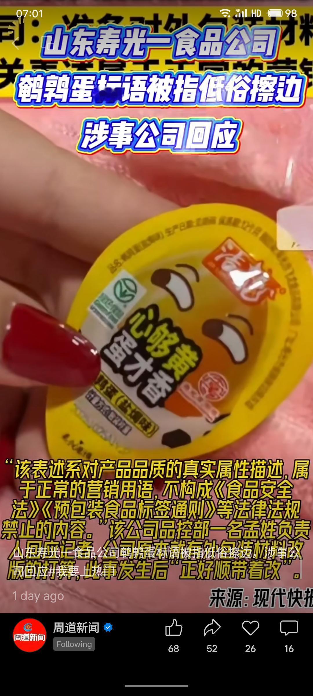 山东一食品公司因产品包装上“鹤鹑蛋”的标语被指低俗擦边。涉事公司回应称,该表述是对产品属性的真实描述,属于正常营销用语,不违反相关法规。公司同时表示,将趁此机会对包装材料进行修改。