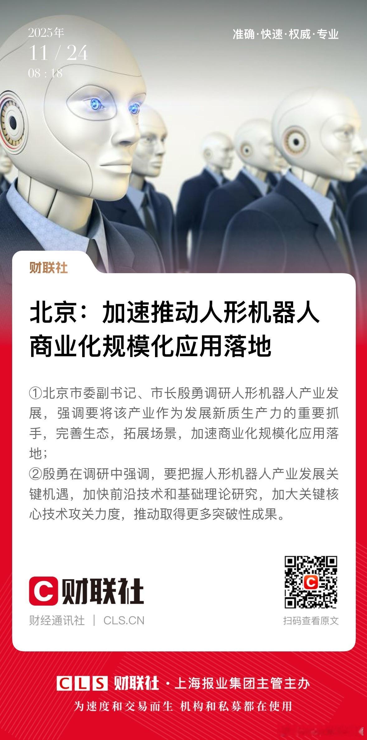 加速推动人形机器人商业化规模化应用落地,殷勇调研人形机器人产业发展。日前,北京市委副书记市长殷勇围绕人形机器人产业发展,深入昌平区海淀区机器人企业开展调研。他强调要深入贯彻党的二十届四中全会精神,落实市委十三届七次全会部署,将人形机器人产业作为大力发展新质生产力的重要抓手,完善产业发展生态,探索拓展应用场景,加速推动人形机器人商业化规模化应用落地,打造全球领先的人形机器人技术创新和产业聚集地。