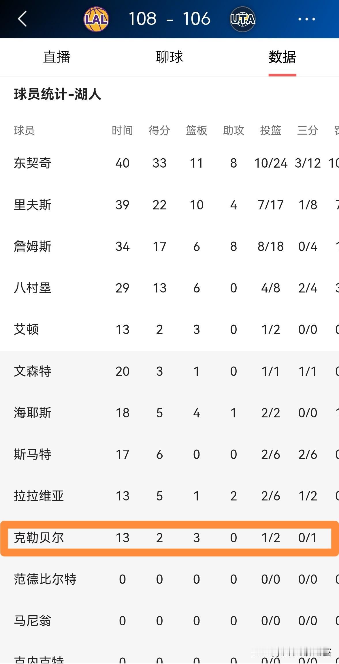 湖人大将克勒贝尔真是不负众望!今天湖人在客场以108:106力克爵士,喜迎三连胜。本场比赛,克勒贝尔替补出战13分钟,投篮2中1得到2分3篮板,他的场上正负值为+1。 值得注意的是,在第四节比赛的关键时刻,克勒贝尔被主帅雷迪克留在了场上,而克勒贝尔也用自己的出色表现回馈了雷迪克教练的信任。