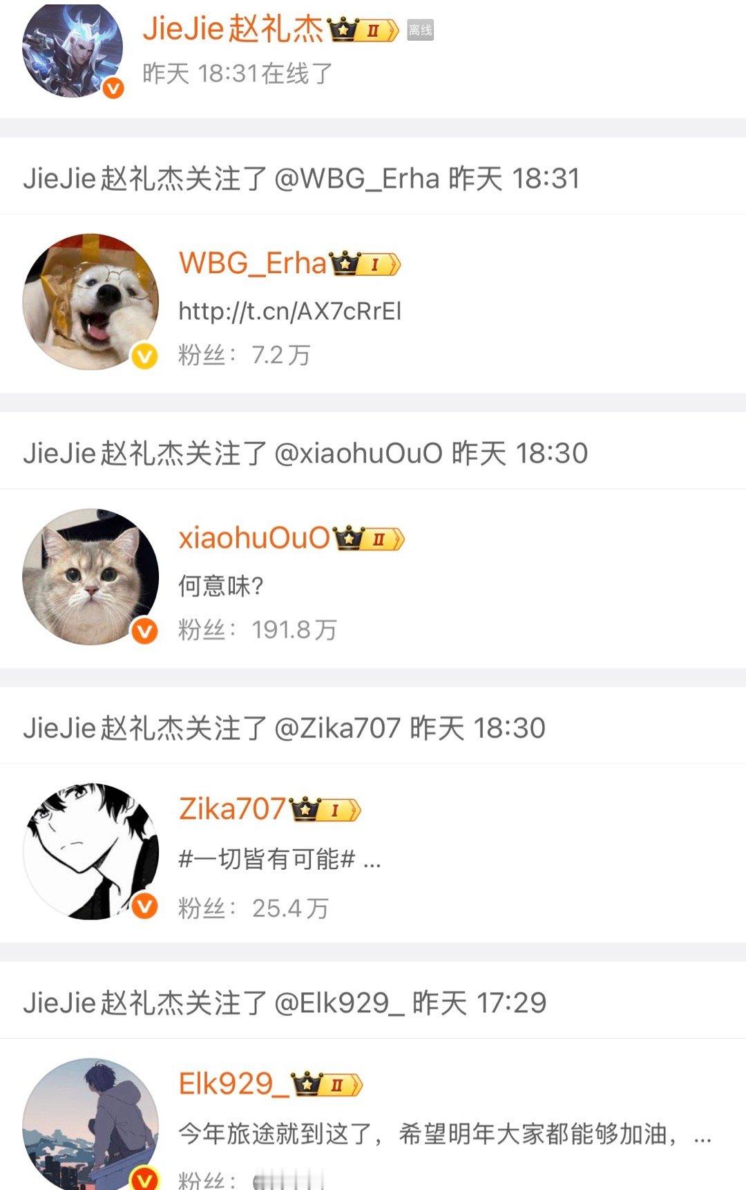 JieJie昨天也上线关注了WBG的其他四个队友 这是什么下野的默契吗