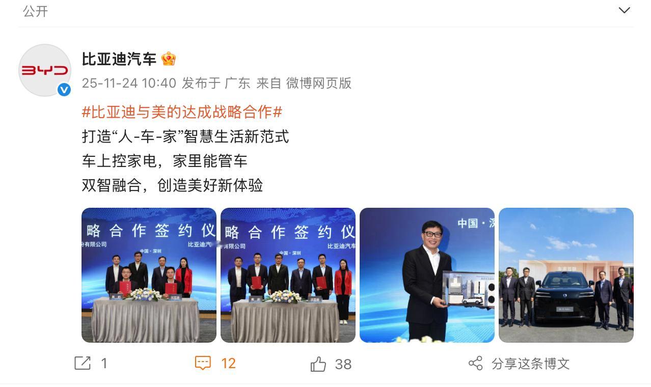 比亚迪今日宣布与美的达成战略合作,打造“人-车-家”智慧生活新范式,车上控家电,