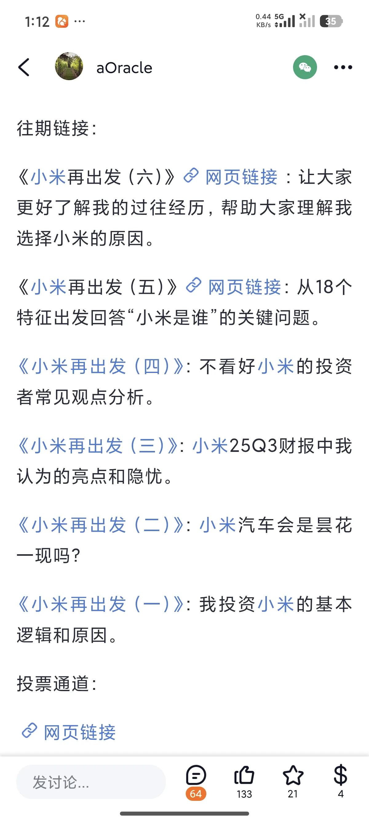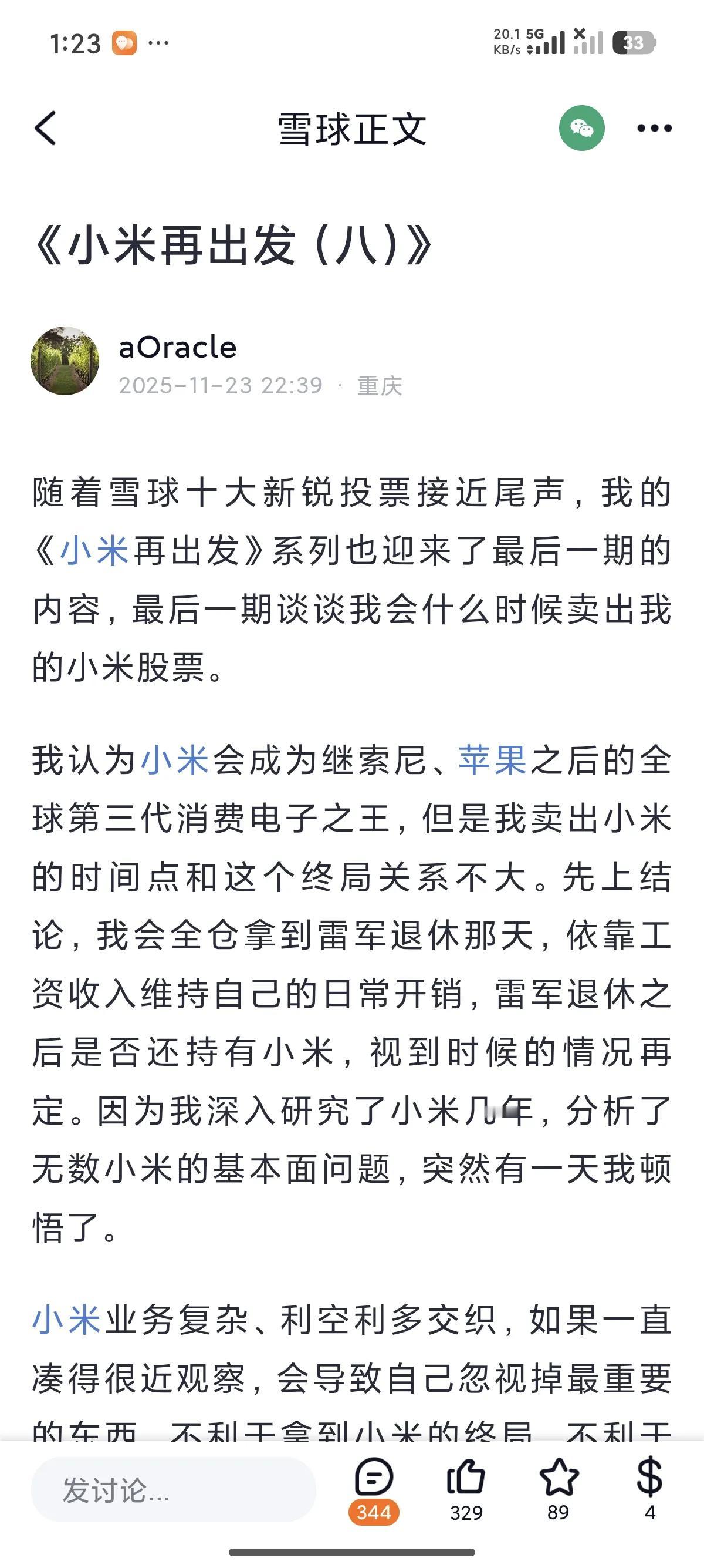 小米这家企业,常人往往难以洞悉其全貌,多数人只会盲目跟从网上的观点,随波逐流,毫无自己的见解。小米股票涨时他们惶恐,跌时他们也畏惧,根本无法坚定持有!真正想要了解小米这家公司及其未来走向的人,不妨认真研读一下《小米再出发》,小米这家公司的未来必定一片光明! 我是重仓且只持有小米这一只股票的,从股价60多块跌至38块,回撤了30%,但我一股都没卖。如今唯一的遗憾就是手头没钱进行加仓了。 《小米再出发》小米是不是一家优秀的企业 闲谈小米汽车