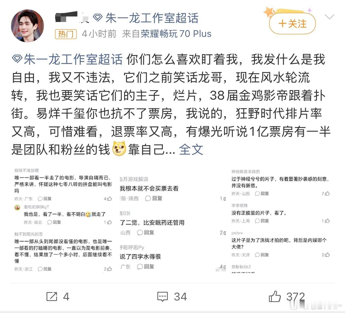 演员早就完成了自己的使命,最后成片如何跟演员有什么关系,借着电影踩易烊千玺的都是什么成分?知道了,狂野光预售就比7000万多,别这么破防了好不好路人只会觉得二番真的很在意一番的电影。