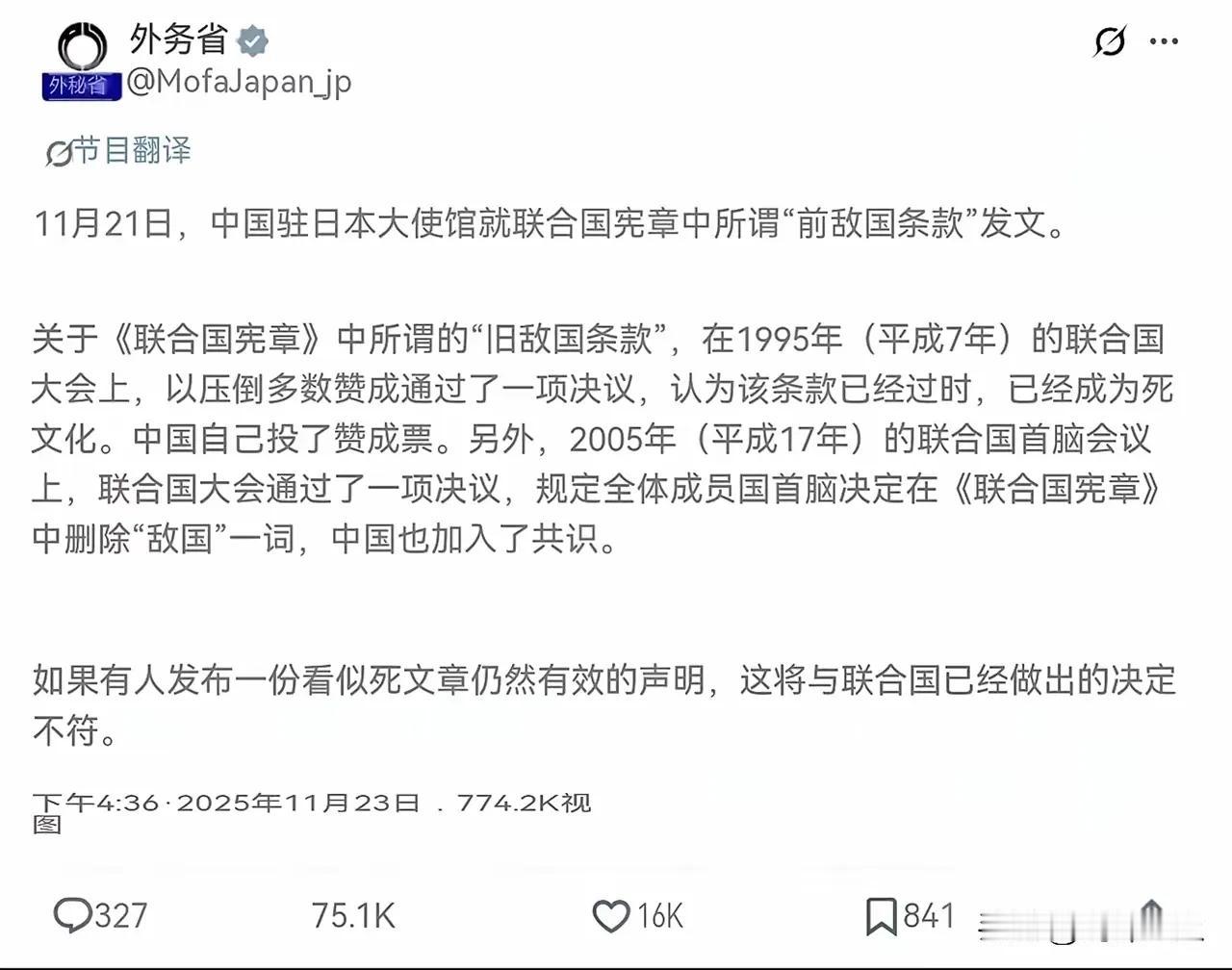 日本外务省11月23日称,“关于《联合国宪章》中“旧敌国条款”,在1995年的联