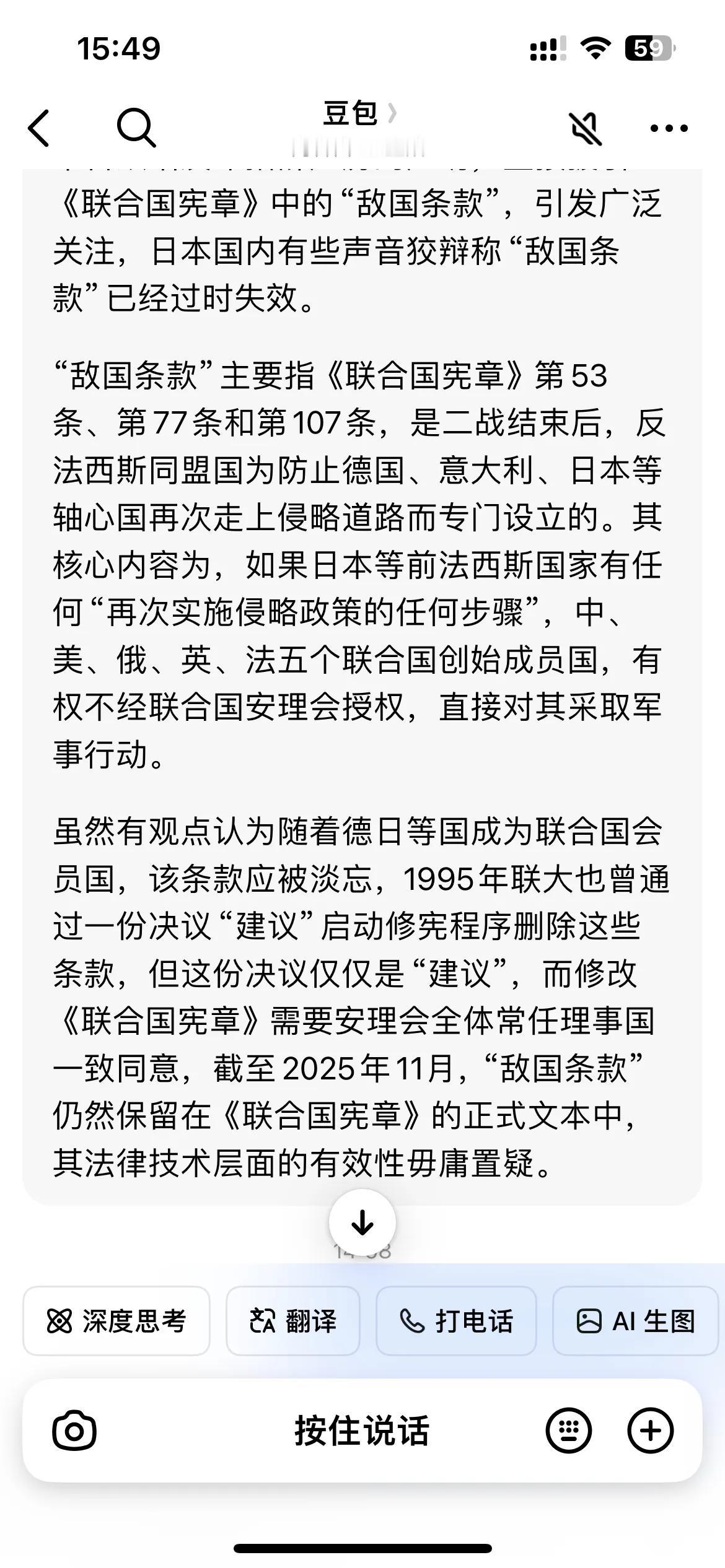 日本外务省11月23日称,“关于《联合国宪章》中“旧敌国条款”,在1995年的联合国大会上,以压倒多数赞成通过了一项决议,认为该条款已过时,已经成为死文化。中国自己投了赞成票。另外,2005年联合国首脑会议上,联合国大会通过了一项决议,规定全体成员国首脑决定在《联合国宪章》中删除‘敌国’一词,中国也加入了共识。 如果有人发布一份看似死文章依然有效的声明,这将于联合国已做出的决定不符。” 狡辩。这里,日本外务省多次提到的的“决议”都只是“建议”,不是日本外务省所说的“决议”。如果是“决议”必定会在《联合国宪章》中有所体现,而现在,“敌国条款”依然保留在《联合国宪章》正式文本中,并未被删除。因为若想修改《联合国宪章》这等大事必须经联合国安理会常任理事国一致同意才能做到、有效,开一些会提一些所谓的“建议”,可以,但它就不是日本外务省所说的“决议”。 可以预料,日本会在这个问题上纠缠不休,因为“纠缠不休”日本最擅长。 从我们的角度看,日本极力否认“旧敌国条款”的存在就是为其武力介入台海局势时“理直气壮”,那么好吧!从我们的角度看,就算“敌国条款”在《联合国宪章》中被删除了又能怎么样?如果日本胆敢武力介入台海局势就“构成侵略”,解放军就是要对其迎头痛击,让日本全境沦为战场、踏上日本领土又有何不可?!让日本再签一次投降书又有何不可?!再次确认“敌国条款”的存在又有何不可?!如果日本胆敢武力介入台海局势,这是等着日本的不容置疑的唯一结局。