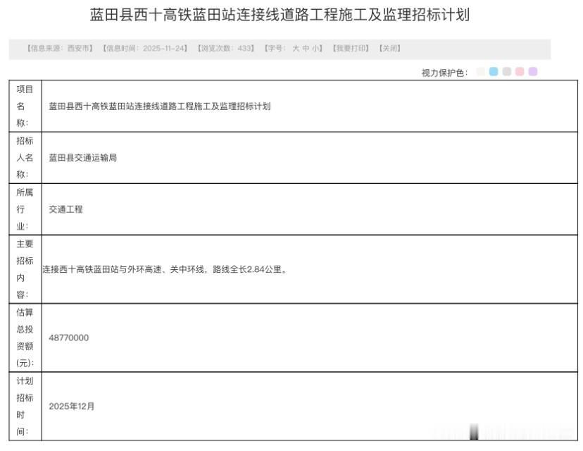 西十高铁蓝田站连接线要招标,出行更方便啦 好消息!蓝田县交通要添新动作——西十高铁蓝田站连接线道路工程,要启动施工及监理招标啦! 项目由蓝田县交通运输局负责招标,主要是修一条2.84公里的路,把西十高铁蓝田站和外环高速、关中环线连起来,以后从高铁站转高速、走环线能省不少事!整个项目估算总投资约4877万元,计划2025年12月正式招标。 这条路修好后,不管是坐高铁出行,还是自驾上高速,都会更顺畅,周边居民日常通勤、外地游客来蓝田游玩也更方便。期待招标顺利推进,早点开工建设!