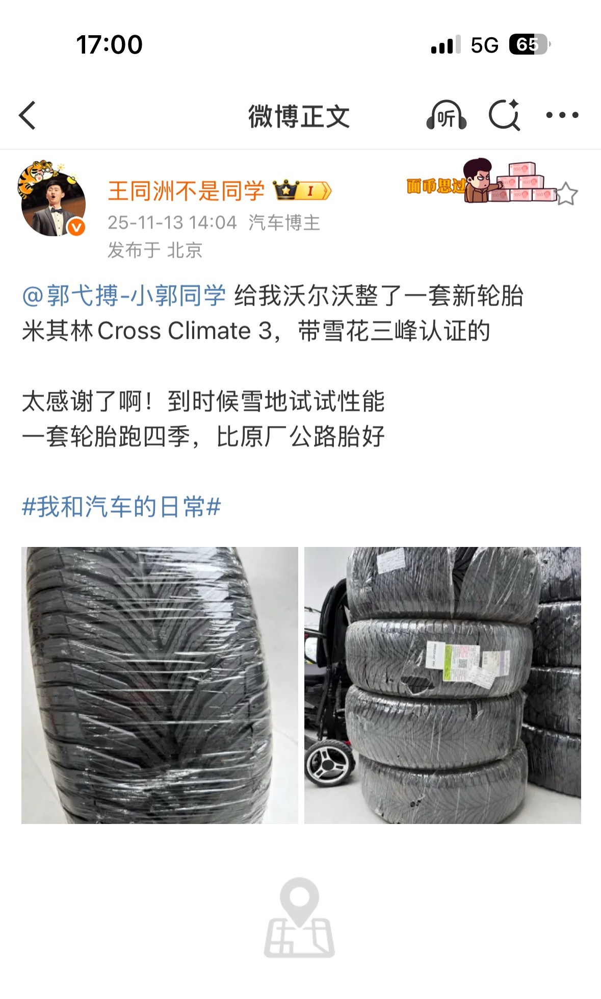 老家那台森林人现在用的米其林新冰驰海拉尔那边冬天必须用冬季胎斯巴鲁配上冬季胎,在我家那边贼稳夏天换上旅悦SUV+主打静音舒适,斯巴鲁隔音很差,换胎后噪音小了很多,这两套胎用了2年多了,性能上没感觉到下降,这也是米其林胎耐久性比较强的优势。马上给 的V90 CC送一套最新的跨季胎Cross Climate 3,下周去崇礼滑雪。这个胎带雪花标识,单导向,雪地有不错抓地力,夏天也能继续用,适合华北地区。轮胎还是尽量买好的,换套好轮胎对于车辆稳定性,隔音降噪,甚至底盘质感都有提升。