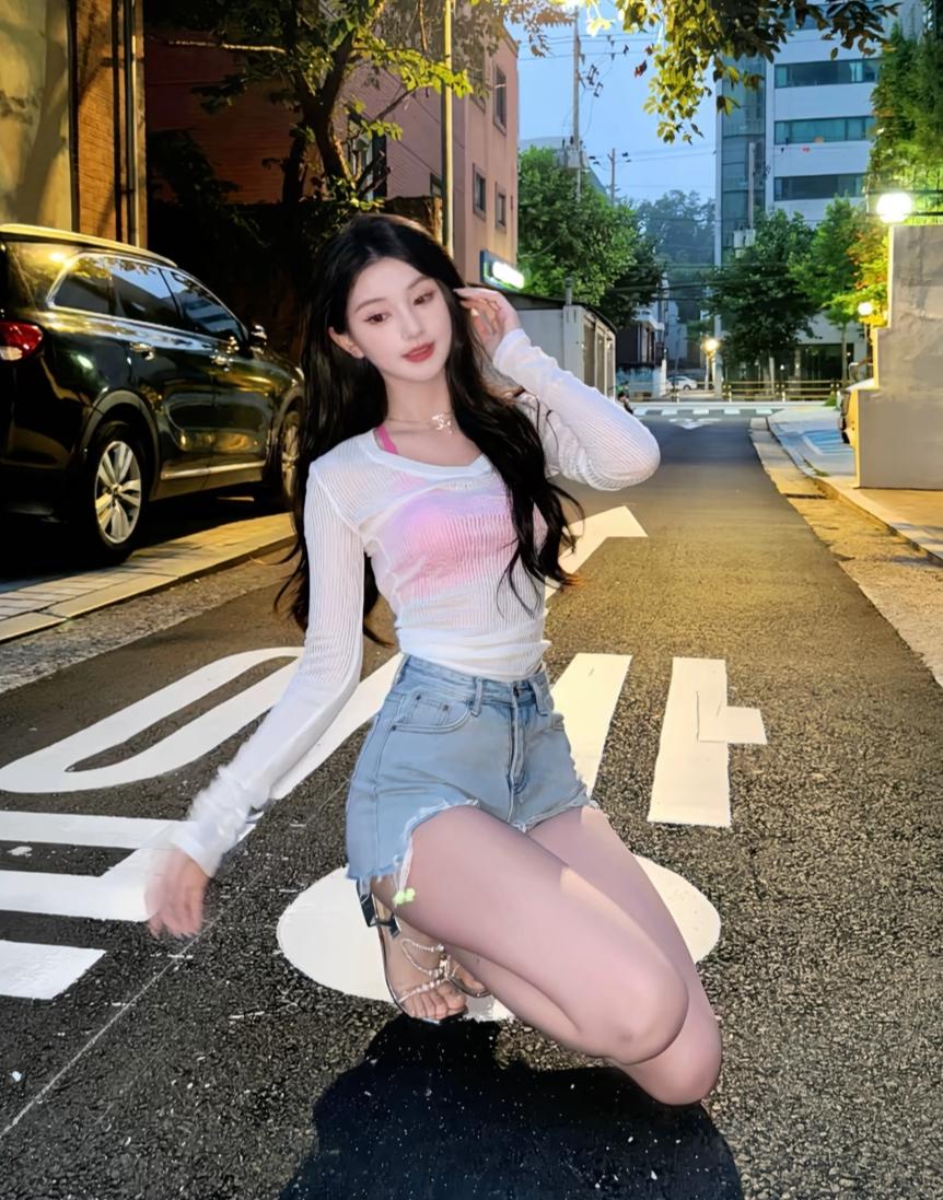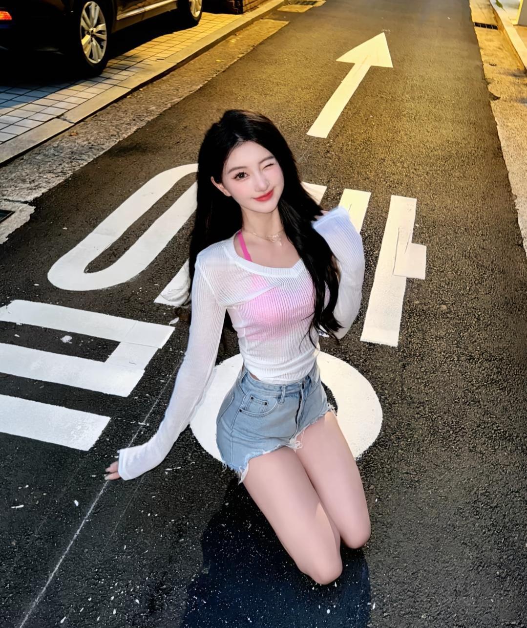 都市街拍,时尚少女,白T恤+牛仔短裤,轻松自在。