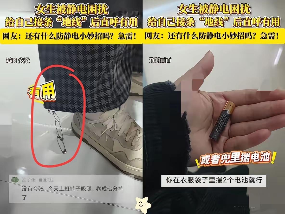太有头脑了!安徽一女子被静电困扰,几乎天天都被电,她灵机一动,竟用3个曲别针串成串,别在裤脚当“人工地线”,立马不粘腿、不触电,零成本搞定大麻烦! 这才是真智慧啊!比起花大价钱买那些华而不实的“防静电神器”,生活里的小物件+基础常识,往往直击问题核心。 其实静电说白了就是干燥环境下电荷没处放,不用搞复杂的,找对传导路径就行。 你还有什么不花钱的防静电小妙招?评论区分享下,让大家冬天少遭罪~