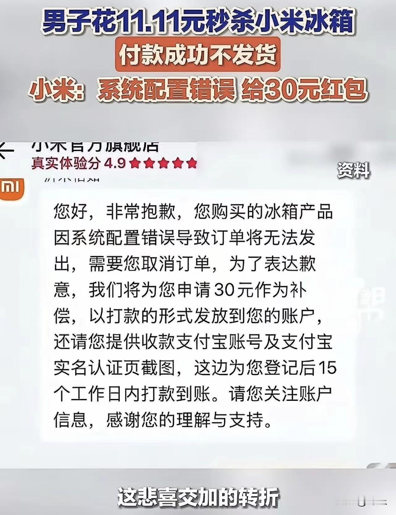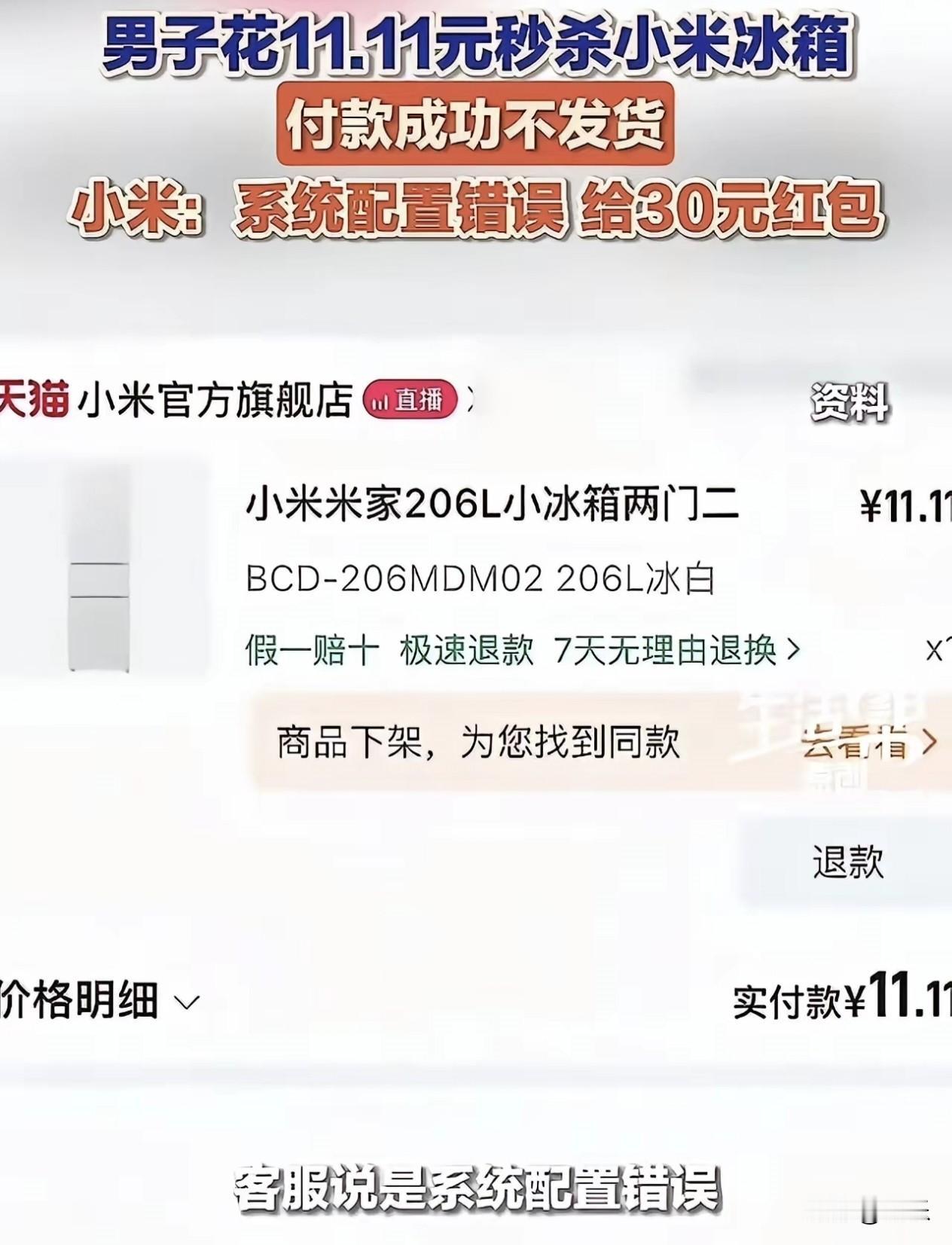 “毫无契约精神!” 河南张先生花11.11元秒杀到小米冰箱,付款成功后商家却拒不发货,只愿给30元红包补偿。张先生怒怼:这是把我当要饭的? 张先生攥着手机,看着小米旗舰店客服发来的“30元补偿红包”方案,气得当场拍了桌子! 双十一当天,他刷到小米旗舰店的冰箱秒杀活动,标价仅11.11元。他紧盯着倒计时,手指悬在支付键上,时间一到立刻点击下单,听到支付成功的提示音时,高兴得跳起来喊了声“欧耶!” 可让他没想到的是,客服随后发来消息:“系统配置错误,订单无法发货,建议您取消订单,我们补偿30元红包。”“30元?这是打发叫花子呢?”张先生当场炸毛,“我秒到的是冰箱,不是30块钱!你们活动页面明明白白写着‘秒杀成功即发货’,现在这是玩不起了?” 市场监管总局数据显示,2024年双十一期间,电商秒杀不发货投诉同比增15%,超四成以“系统错误”为借口。 付款成功即形成交易合同,商家单方面违约,本质是漠视消费者权益和自身承诺。 秒杀活动是商家吸引流量的手段,玩不起就别搞,临时毁约只会砸了品牌口碑。 诚信是商家的立身之本,流量再重要也不能丢了信誉。既然承诺“秒杀成功即发货”,就该履行约定,否则既伤消费者心,也毁自己招牌。