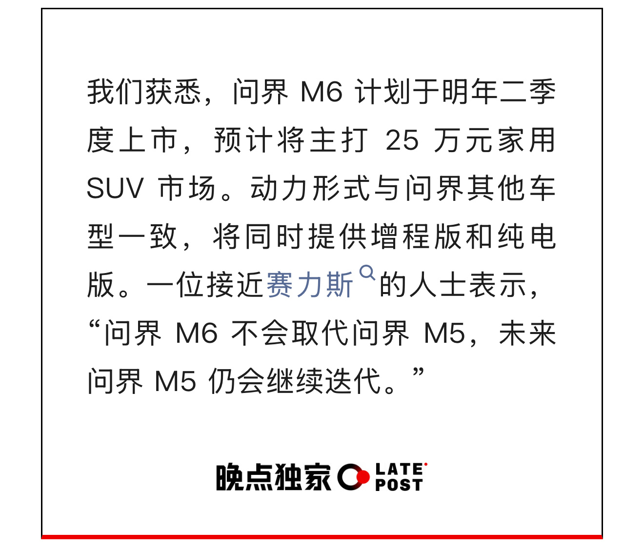 问界M6计划2026年第二季度上市,将主打25万元级家用SUV市场。动力形式延续问界家族双动力布局,提供增程版与纯电版可选。