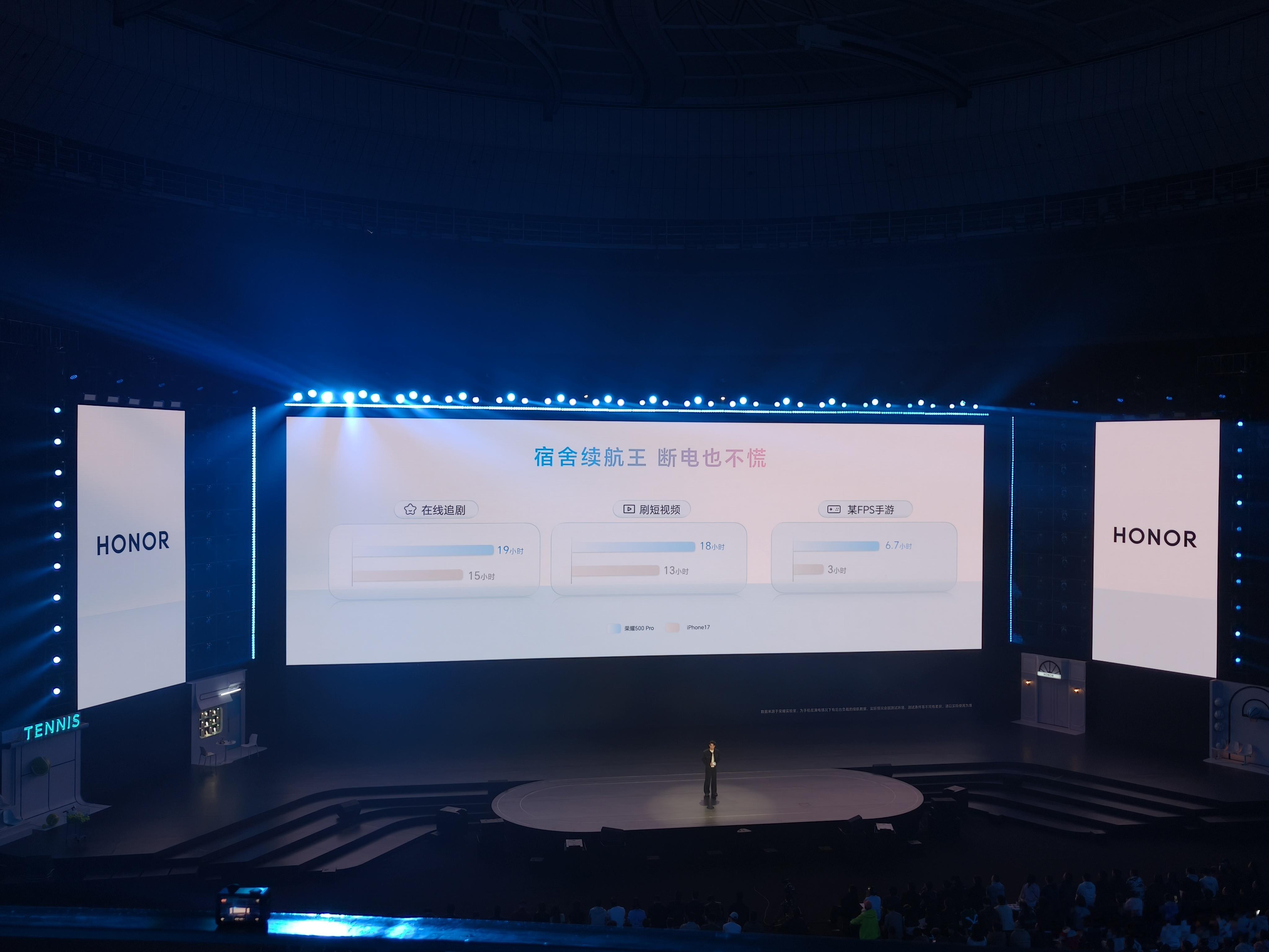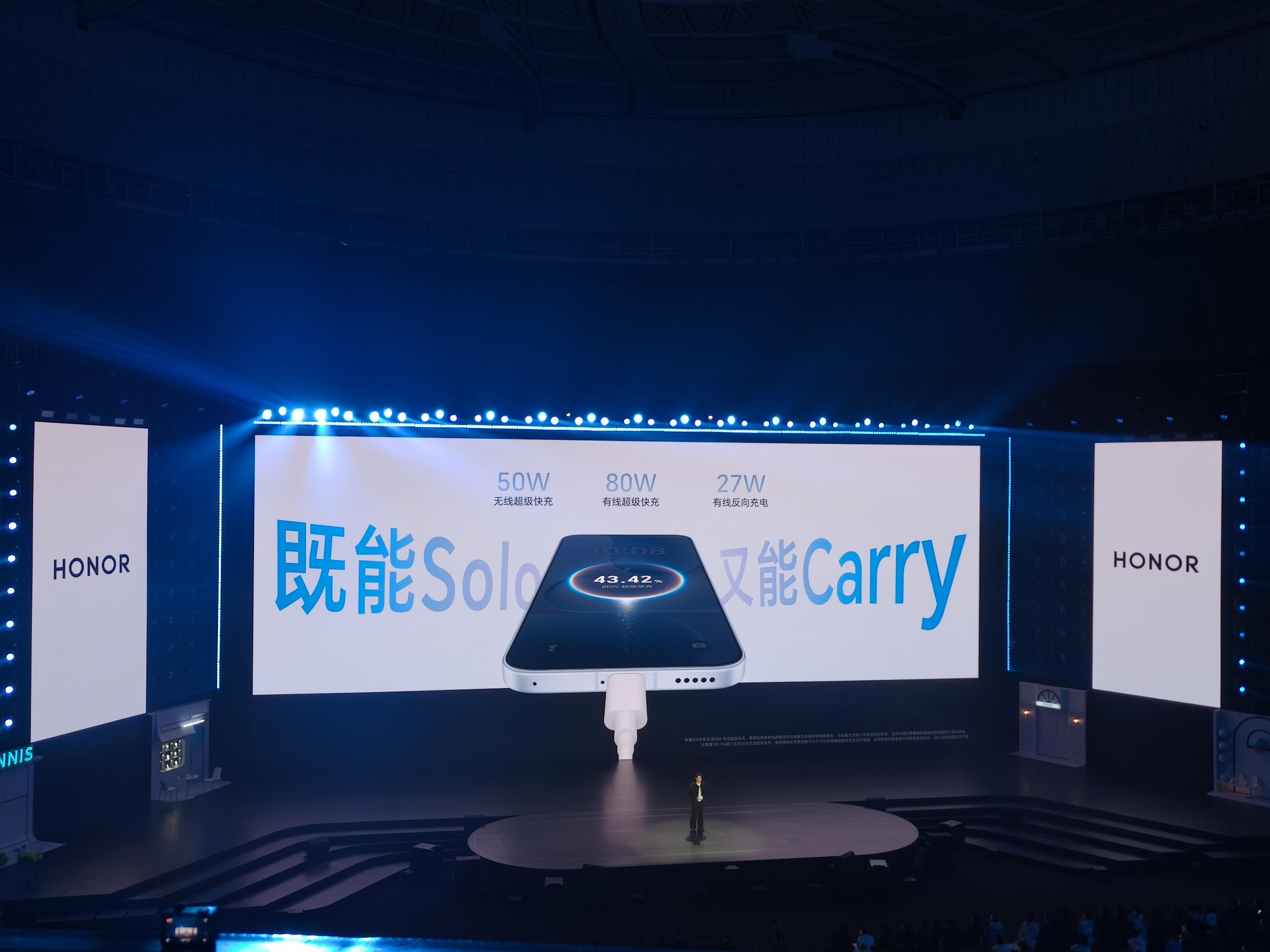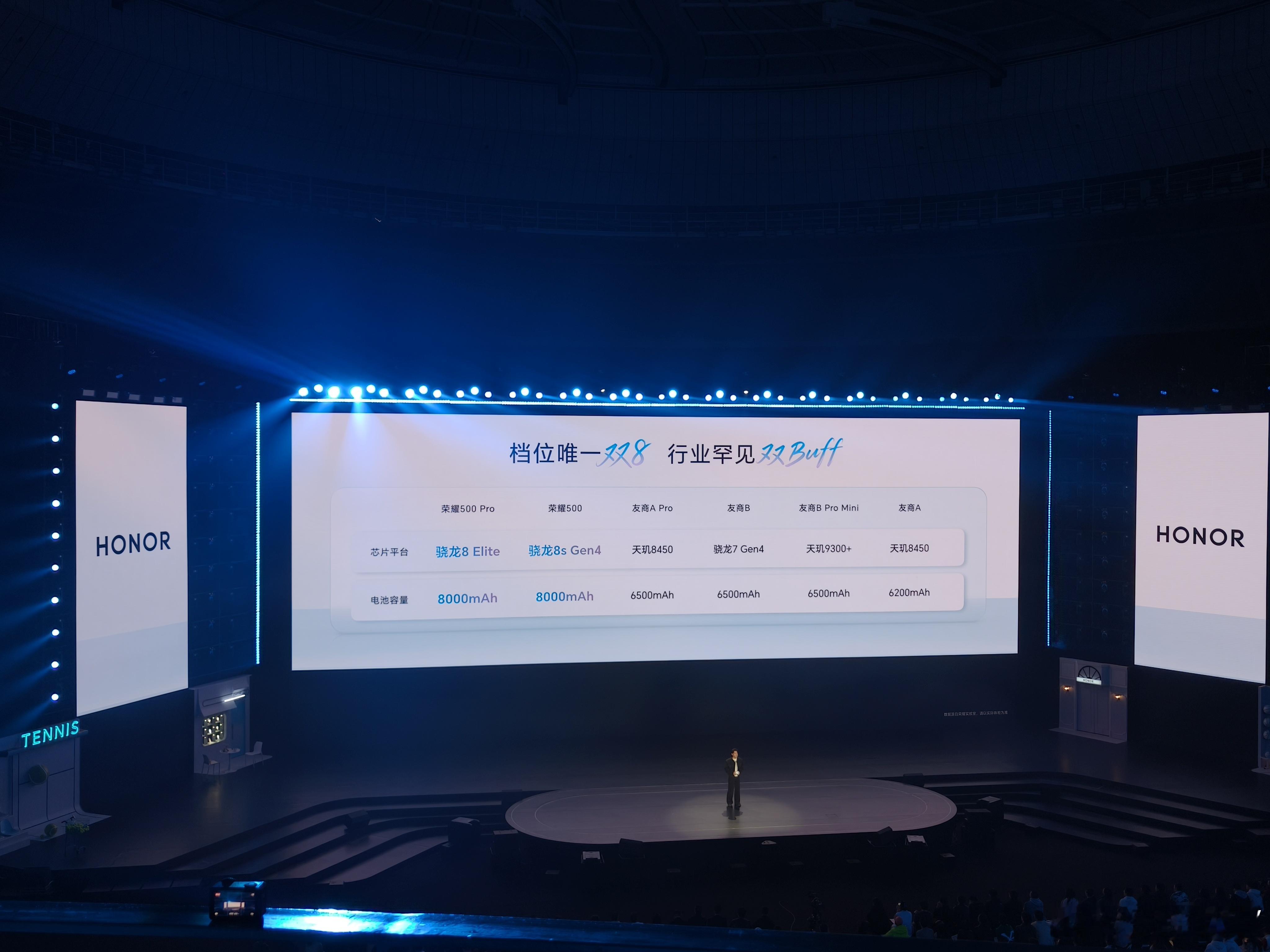 荣耀500系列超大电池,超久续航! 荣耀500全系搭载8000mAh青海湖大电池,并搭载旗舰同款HONOR E2能效增强芯片及都江堰AI电源管理系统,深度优化电池使用场景,实现续航“0”焦虑。 荣耀500系列搭载80W有线超级快充,Pro搭载50W无线超级快充,并全系支持行业最强的27W有线反向充电,你的苹果好搭子,carry全场。
