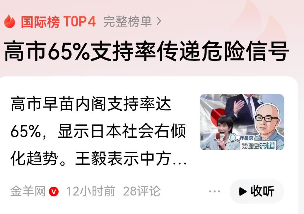 高市早苗内阁支持率高达65%,这数据背后藏着大问题,说明日本军国主义复活确实有深厚民意基础。日本共同社民调显示,高市内阁支持率攀升至69.9%,48.8%受访者支持其涉台谬论,60.4%民众认可增加防卫费。近半数日本民众支持在台海紧张时行使自卫权。 这些数据表明日本社会整体“右转”态势加剧。多年来,东北亚局势紧张,美国态度摇摆,日本右翼势力趁机煽动情绪。越来越多民众支持强军扩武,背离和平发展。日本军国主义的幽灵,真的要危险地觉醒了。