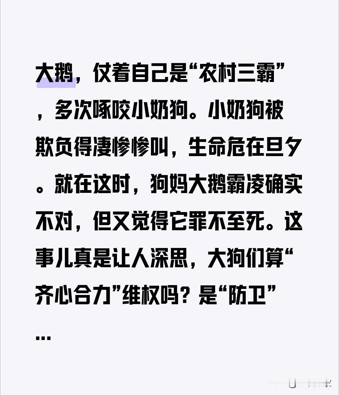 家人们谁懂啊,河南周口一场动物界的“霸凌复仇战”火了!一只嚣张的大鹅,仗着自己是“农村三霸”,多次啄咬小奶狗。小奶狗被欺负得凄惨惨叫,生命危在旦夕。就在这时,狗妈妈和狗哥哥等3只成年犬冲了过来。它们可不是闹着玩,招招下死口,几个回合就把大鹅咬死了。 主人周女士很纠结,觉得大鹅霸凌确实不对,但又觉得它罪不至死。这事儿真是让人深思,大狗们算“齐心合力”维权吗?是“防卫”还是“防卫过当”?主人会惩罚大狗吗?快来评论区说说你的看法! 假如鹅被打垮 狗抓大鹅 鹅追狗 鸭鹅争斗 鹅鸭杀 鹅鹅冲突 鹅大战狗