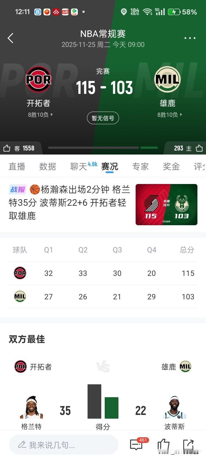 没有字母的雄鹿那不就是雄鹿!完全没有野性!要防守没防守,要进攻没进攻!阵容完全匹配不上开拓者,内线直接是碾压!克林根篮板抢了多少,内线直接掀翻!阿芙迪亚跟格兰特能突能抢,还能投!两人投进了8个三分! 比赛在第3节就已经花了!雄鹿特纳我一看还不如小杨来,其他上都是在外面投三分,今天还有波迪斯也跟他同一类型,都是飘在外头!准还行!不准啥也不是!你是看比分差10几分,第四节中段分差来到30几分,最后又追回10几分,那都没有什么意义!唯独遗憾小杨,只上场了几分钟!杨瀚森 nba